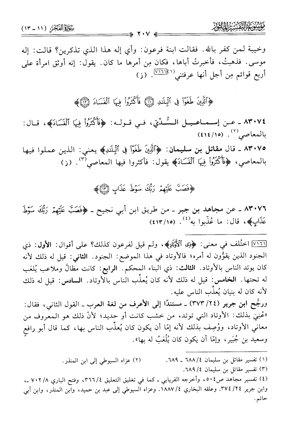 [٧١٦١] اختُلف في معنى: {ذِي الأَوْتادِ}، ولم قيل لفرعون كذلك؟ على أقوال: الأول: ذي الجنود الذين يقوُّون له أمره؛ فالأوتاد في هذا الموضع: الجنود. الثاني: قيل له ذلك لأنه كان يوتد الناس بالأوتاد. الثالث: ذي البناء المحكم. الرابع: كانت مظالَّ وملاعب يُلعَب له تحتها. الخامس: قيل له ذلك لأنه كان يُعذِّب الناس بالأوتاد. السادس: قيل له ذلك لأنه كان له بنيان يُعذِّب الناس عليه.