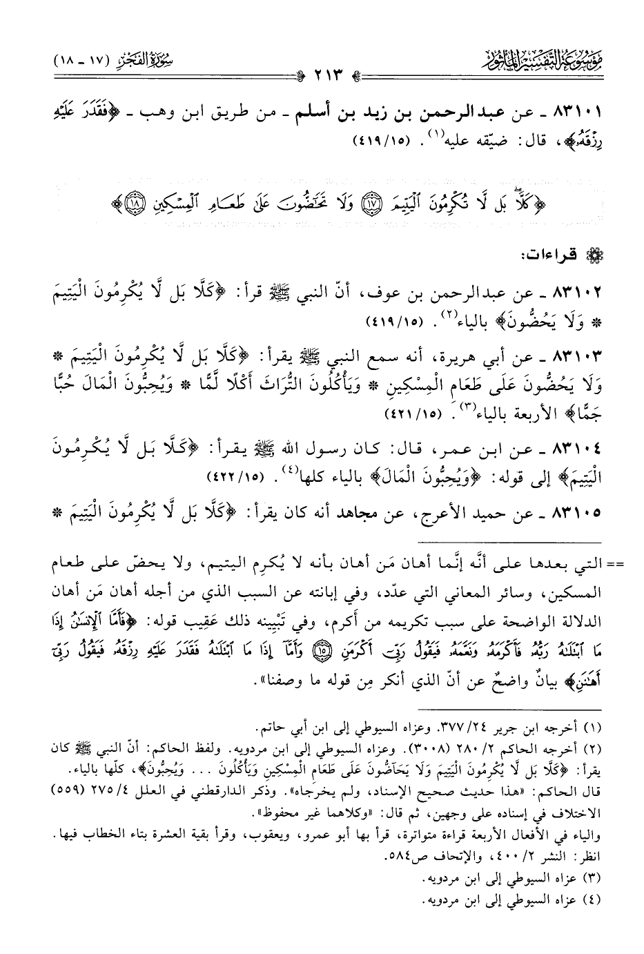 ٨٣١٠٢ - عن عبد الرحمن بن عوف، أنّ النبي - صلى الله عليه وسلم - قرأ: «كَلّا بَل لّا يُكْرِمُونَ اليَتِيمَ * ولا يَحُضُّونَ» بالياء (¬٢). (١٥/ ٤١٩)