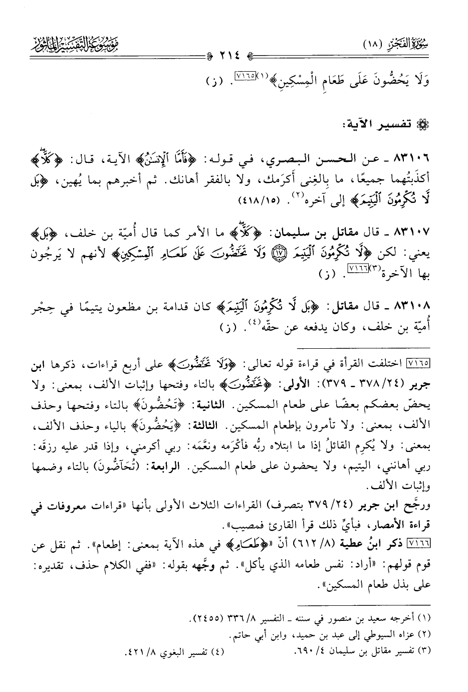 [٧١٦٥] اختلفت القرأة في قراءة قوله تعالى: {ولا تَحاضُّونَ} على أربع قراءات، ذكرها ابن جرير (٢٤/ ٣٧٨ - ٣٧٩): الأولى: {تَحاضُّونَ} بالتاء وفتحها وإثبات الألف، بمعنى: ولا يحضّ بعضكم بعضًا على طعام المسكين. الثانية: «تَحُضُّونَ» بالتاء وفتحها وحذف الألف، بمعنى: ولا تأمرون بإطعام المسكين. الثالثة: «يَحُضُّونَ» بالياء وحذف الألف، بمعنى: ولا يُكرِم القائلُ إذا ما ابتلاه ربُّه فأكْرَمه ونعَّمَه: ربي أكرمني، وإذا قدر عليه رزقَه: ربي أهانني، اليتيم، ولا يحضون على طعام المسكين. الرابعة: (تُحَآضُّونَ) بالتاء وضمها وإثبات الألف.