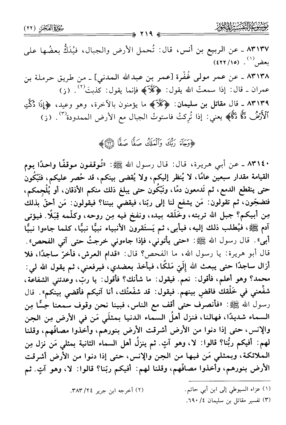 ٨٣١٣٧ - عن الربيع بن أنس، قال: تُحمل الأرض والجبال، فيُدَكُّ بعضُها على بعض (¬١). (١٥/ ٤٢٢)