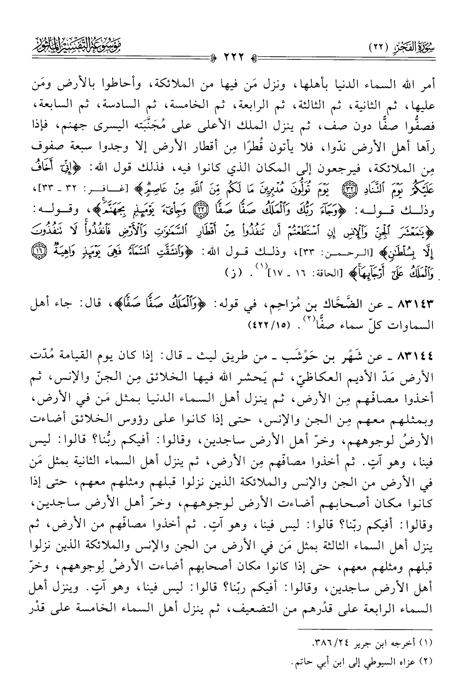 ٨٣١٤٣ - عن الضَّحّاك بن مُزاحِم، في قوله: {والمَلَكُ صَفًّا صَفًّا}، قال: جاء أهل السماوات كلّ سماء صفًّا (¬٢). (١٥/ ٤٢٢)