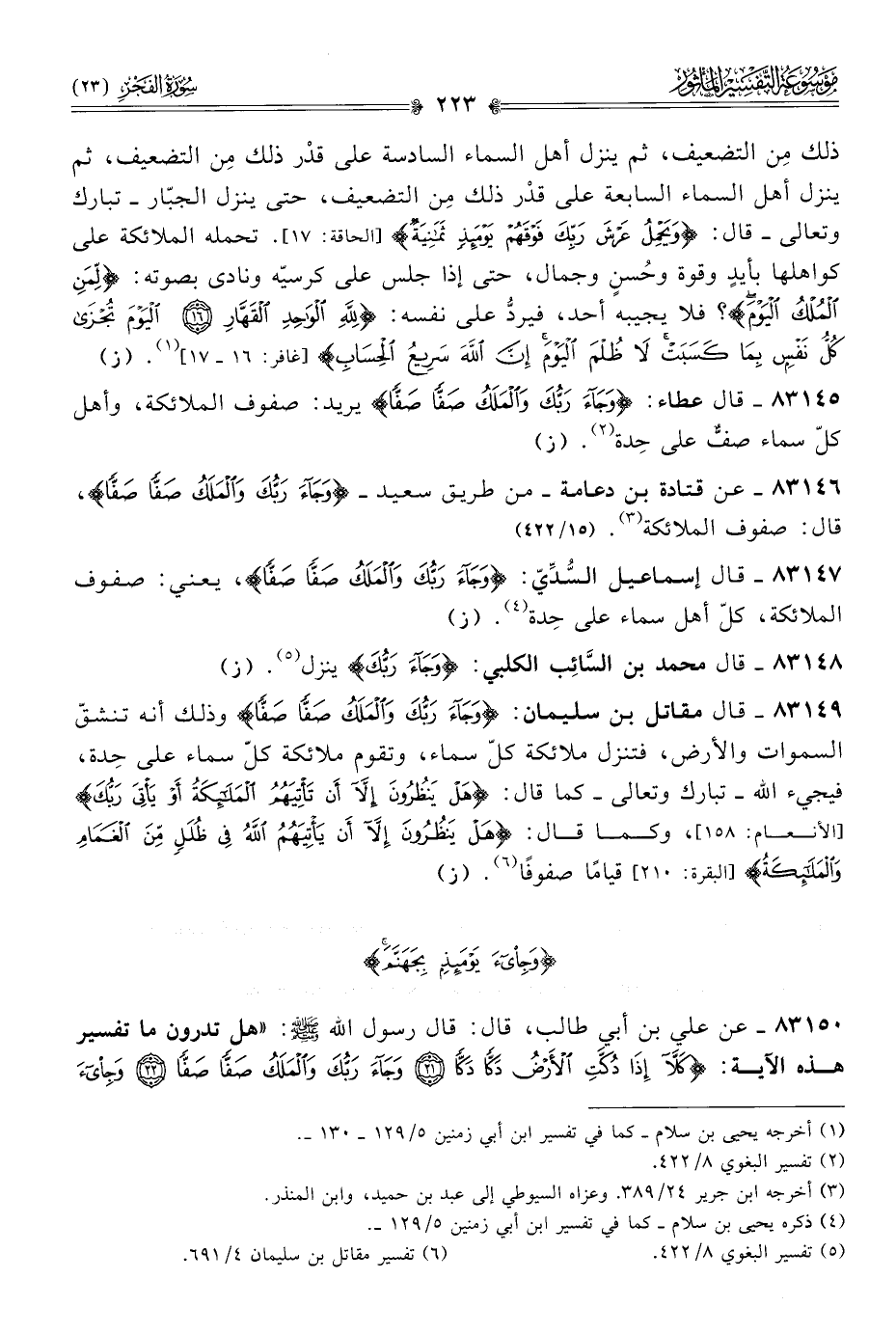٨٣١٤٦ - عن قتادة بن دعامة -من طريق سعيد- {وجاءَ رَبُّكَ والمَلَكُ صَفًّا صَفًّا}، قال: صفوف الملائكة (¬٣). (١٥/ ٤٢٢)