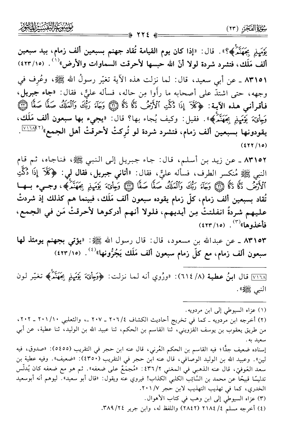 ٨٣١٥٣ - عن عبد الله بن مسعود، قال: قال رسول الله - صلى الله عليه وسلم -: «يؤتي بجهنم يومئذ لها سبعون ألف زمام، مع كلّ زمام سبعون ألف مَلَك يَجُرُّونها» (¬٤). (١٥/ ٤٢٣)