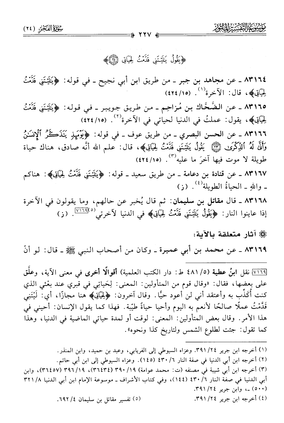 ٨٣١٦٤ - عن مجاهد بن جبر -من طريق ابن أبي نجيح- في قوله: {يا لَيْتَنِي قَدَّمْتُ لِحَياتِي}، قال: الآخرة (¬١). (١٥/ ٤٢٤)