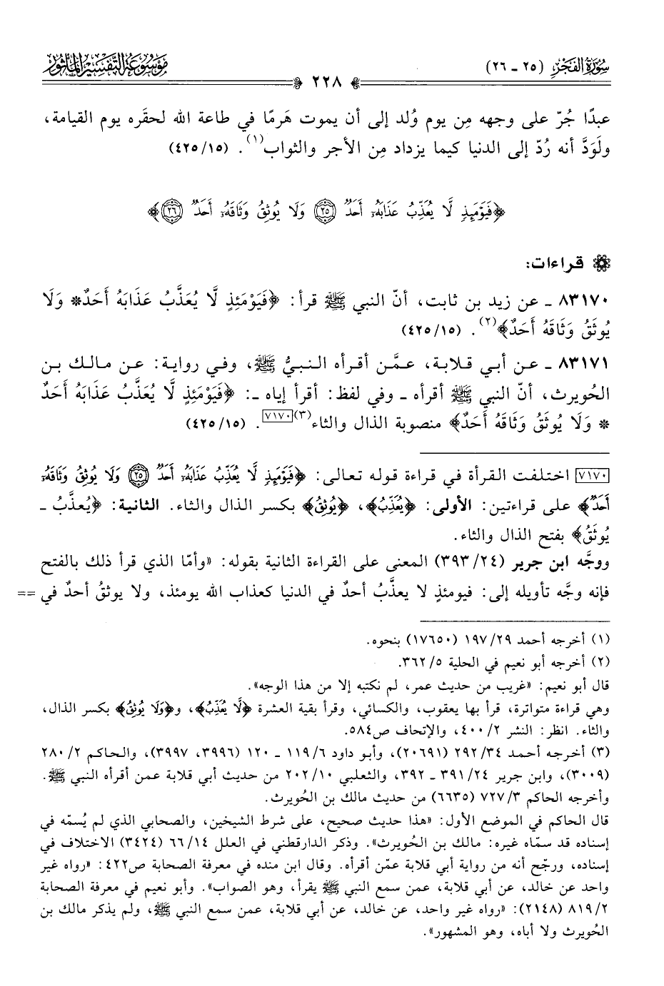 ٨٣١٧٠ - عن زيد بن ثابت، أنّ النبي - صلى الله عليه وسلم - قرأ: «فَيَوْمَئِذٍ لّا يُعَذَّبُ عَذابَهُ أحَدٌ* ولا يُوثَقُ وثاقَهُ أحَدٌ» (¬٢). (١٥/ ٤٢٥)