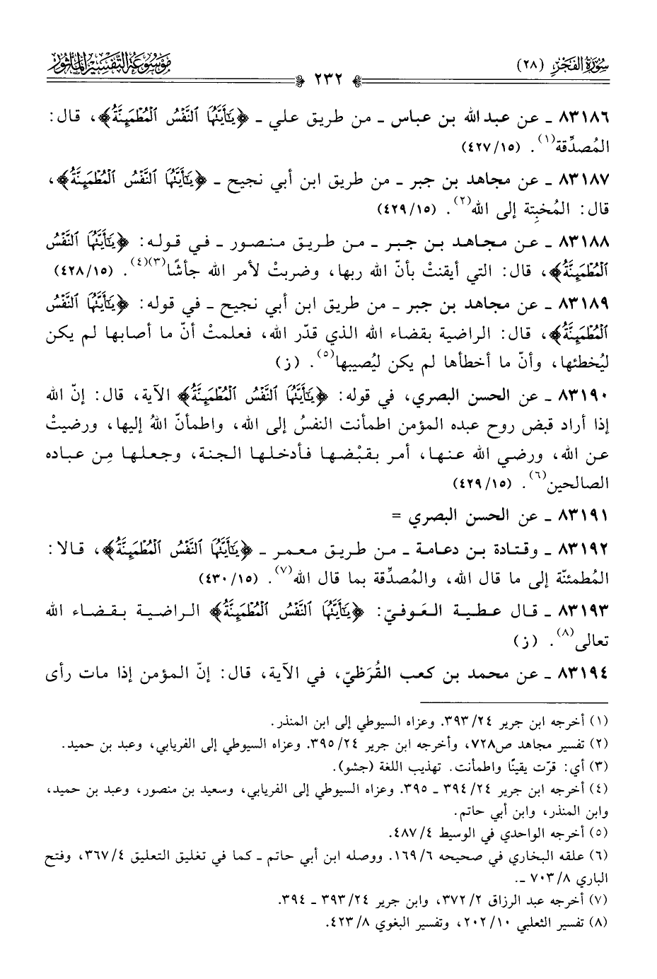 ٨٣١٨٨ - عن مجاهد بن جبر -من طريق منصور- في قوله: {يا أيَّتُها النَّفْسُ المُطْمَئِنَّةُ}، قال: التي أيقنتْ بأنّ الله ربها، وضربتْ لأمر الله جأشًا (¬٣) (¬٤). (١٥/ ٤٢٨)