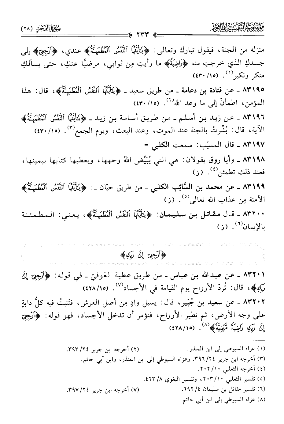 ٨٣١٩٥ - عن قتادة بن دعامة -من طريق سعيد- {يا أيَّتُها النَّفْسُ المُطْمَئِنَّةُ}، قال: هذا المؤمن، اطمأنّ إلى ما وعد الله (¬٢). (١٥/ ٤٣٠)
