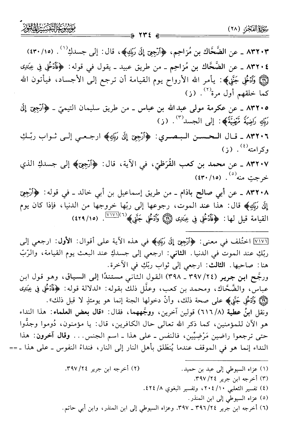 ٨٣٢٠٨ - عن أبي صالح باذام -من طريق إسماعيل بن أبي خالد- في قوله: {ارْجِعِي إلى رَبِّكِ} قال: هذا عند الموت، رجوعها إلى ربّها خروجها من الدنيا، فإذا كان يوم القيامة قيل لها: {فادْخُلِي فِي عِبادِي وادْخُلِي جَنَّتِي} (¬٦) [٧١٧١]. (١٥/ ٤٢٩)