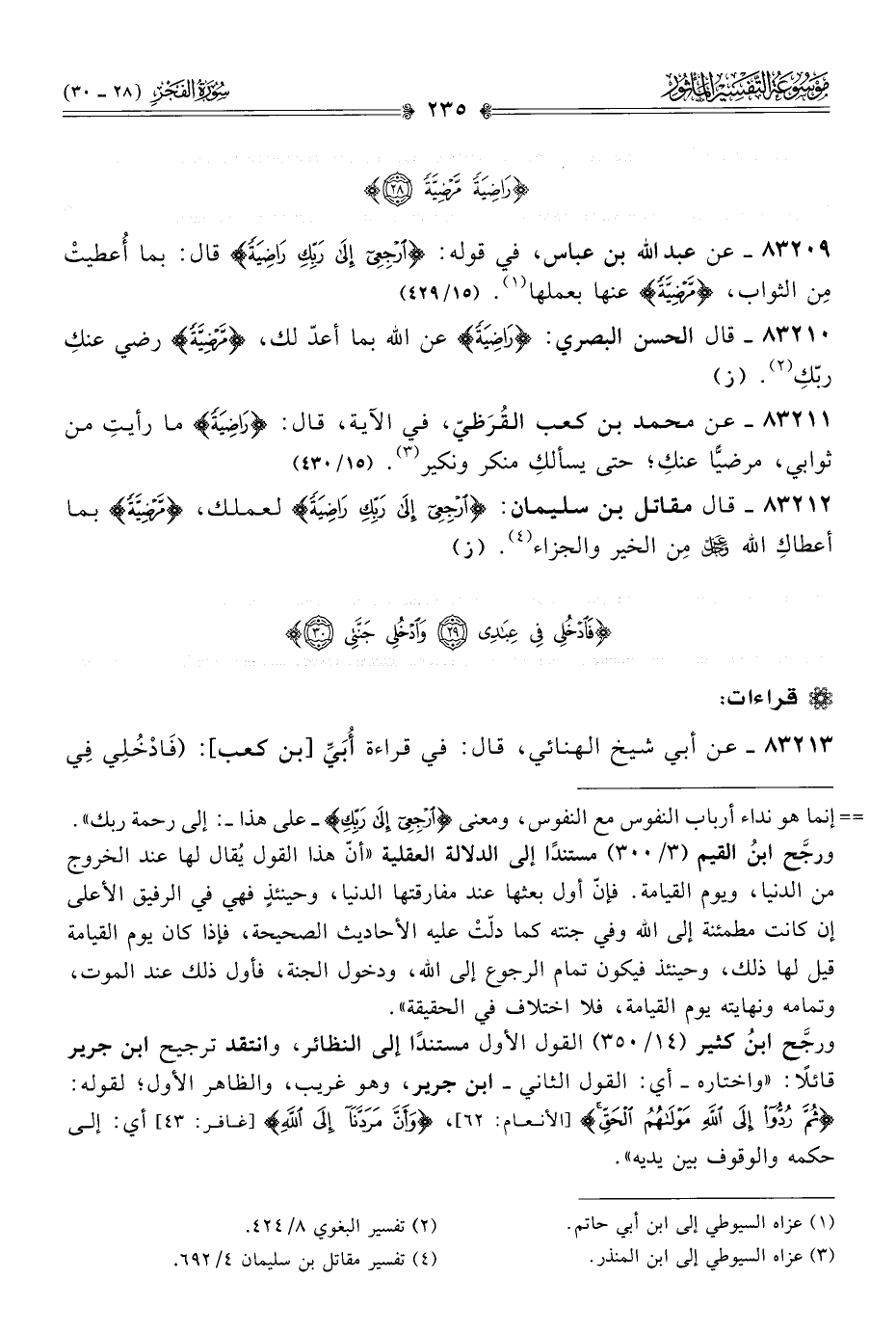 ٨٣٢٠٩ - عن عبد الله بن عباس، في قوله: {ارْجِعِي إلى رَبِّكِ راضِيَةً} قال: بما أُعطيتْ مِن الثواب، {مَرْضِيَّةً} عنها بعملها (¬١). (١٥/ ٤٢٩)