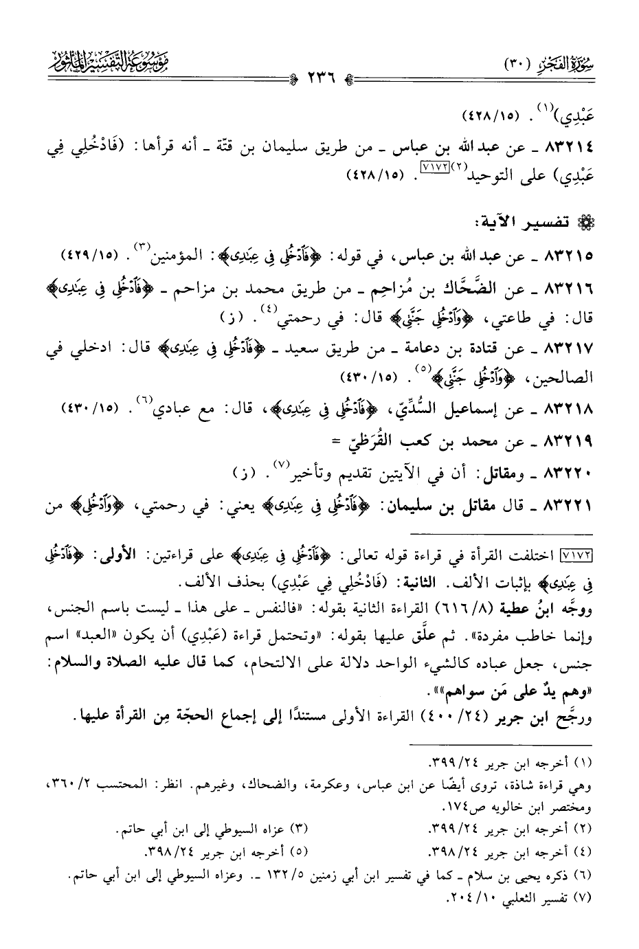 ٨٣٢١٤ - عن عبد الله بن عباس -من طريق سليمان بن قتّة- أنه قرأها: (فادْخُلِي فِي عَبْدِي) على التوحيد (¬٢) [٧١٧٢]. (١٥/ ٤٢٨)