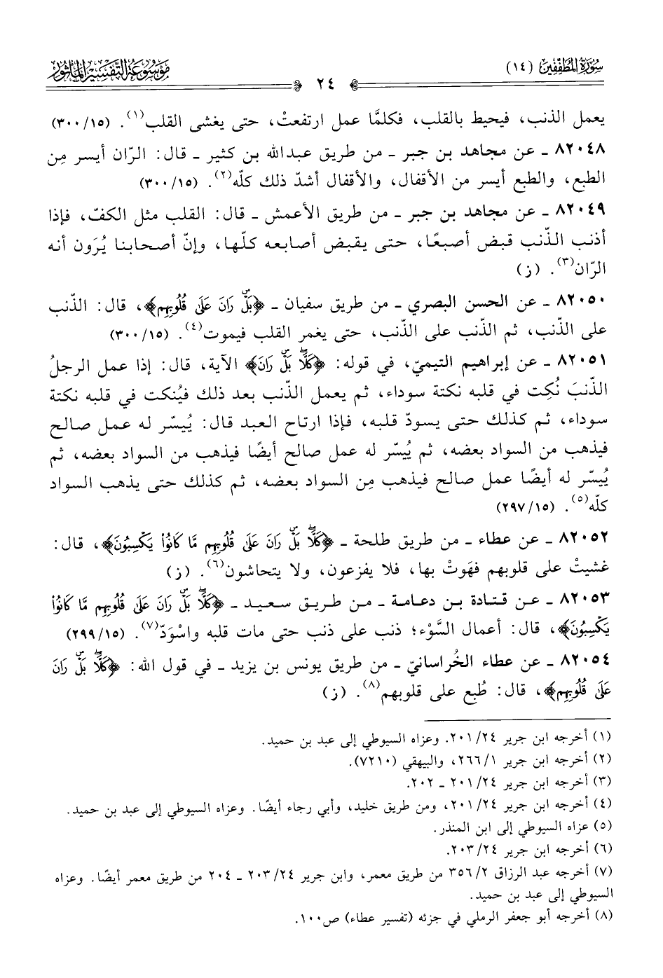 ٨٢٠٥٠ - عن الحسن البصري -من طريق سفيان- {بَلْ رانَ عَلى قُلُوبِهِمْ}، قال: الذّنب على الذّنب، ثم الذّنب على الذّنب، حتى يغمر القلب فيموت (¬٤). (١٥/ ٣٠٠)