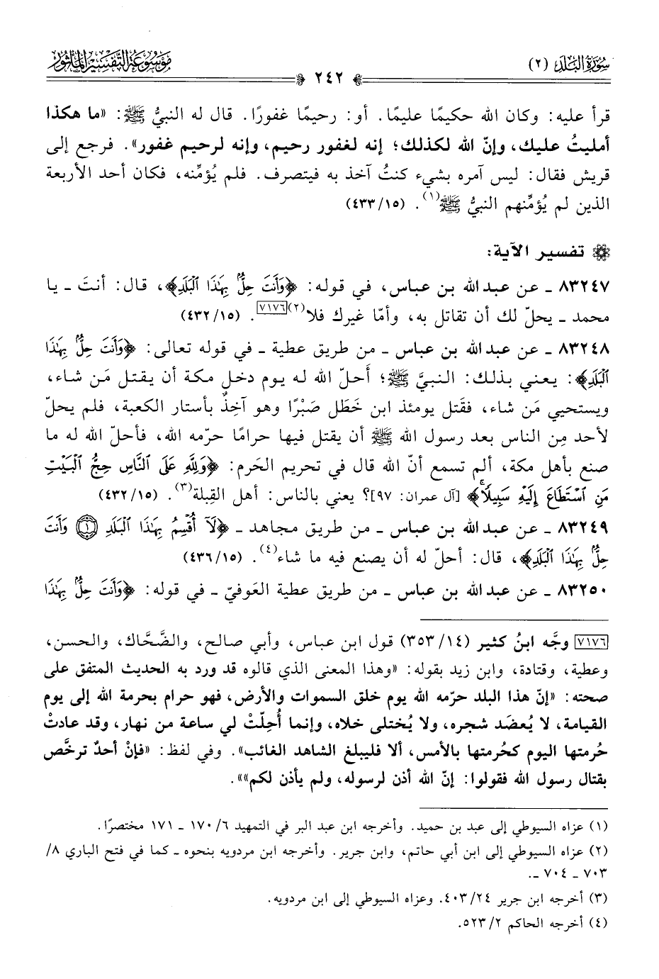 [٧١٧٦] وجَّه ابنُ كثير (١٤/ ٣٥٣) قول ابن عباس، وأبي صالح، والضَّحّاك، والحسن، وعطية، وقتادة، وابن زيد بقوله: «وهذا المعنى الذي قالوه قد ورد به الحديث المتفق على صحته: «إنّ هذا البلد حرّمه الله يوم خلق السموات والأرض، فهو حرام بحرمة الله إلى يوم القيامة، لا يُعضَد شجره، ولا يُختلى خلاه، وإنما أُحِلّتْ لي ساعة من نهار، وقد عادتْ حُرمتها اليوم كحُرمتها بالأمس، ألا فليبلغ الشاهد الغائب». وفي لفظ: «فإنْ أحدٌ ترخَّص بقتال رسول الله فقولوا: إنّ الله أذن لرسوله، ولم يأذن لكم»».