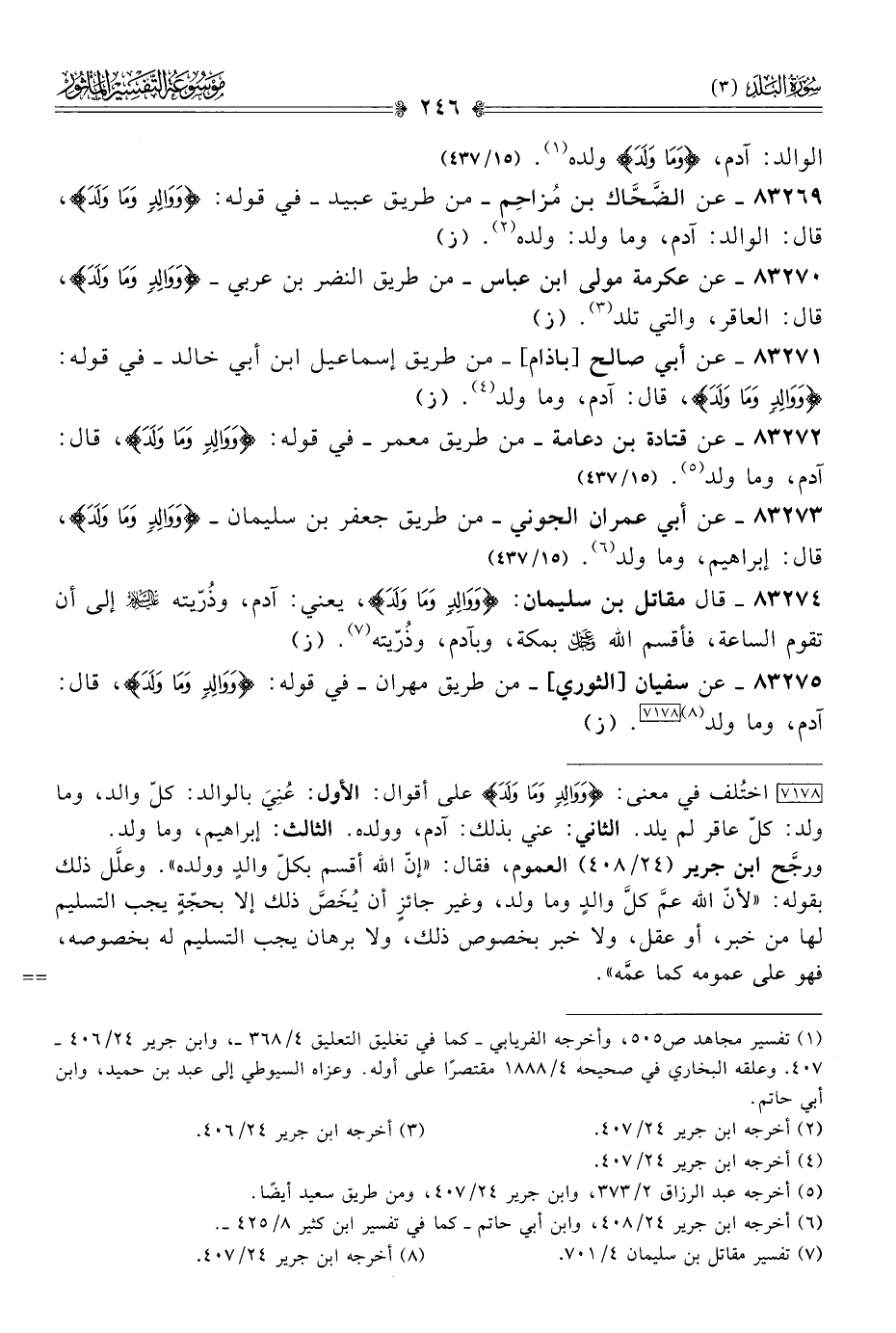 ٨٣٢٧٣ - عن أبي عمران الجوني -من طريق جعفر بن سليمان- {ووالِدٍ وما ولَدَ}، قال: إبراهيم، وما ولد (¬٦). (١٥/ ٤٣٧)