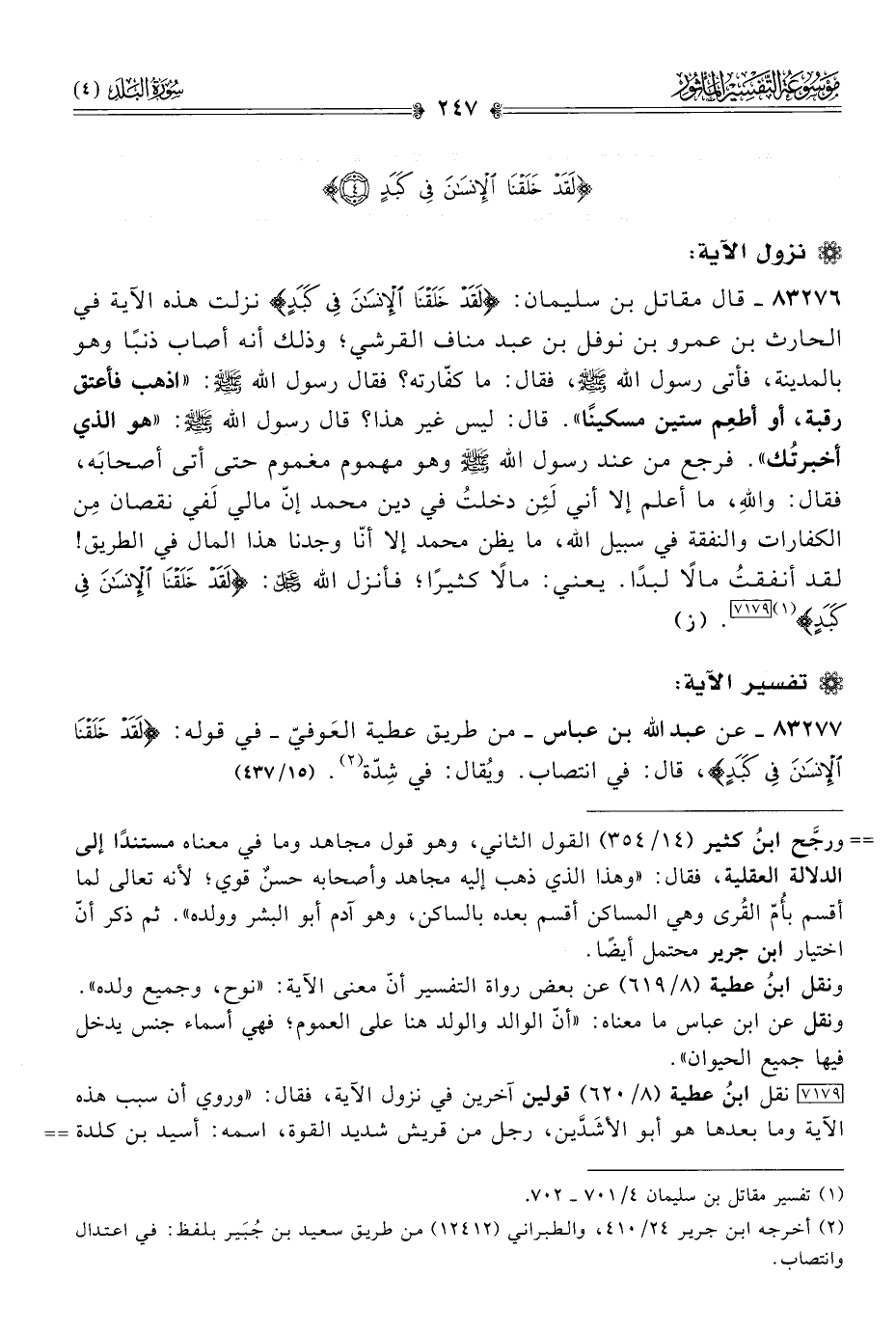 ٨٣٢٧٦ - قال مقاتل بن سليمان: {لَقَدْ خَلَقْنا الإنْسانَ فِي كَبَدٍ} نزلت هذه الآية في الحارث بن عمرو بن نوفل بن عبد مناف القرشي؛ وذلك أنه أصاب ذنبًا وهو بالمدينة، فأتى رسول الله - صلى الله عليه وسلم -، فقال: ما كفّارته؟ فقال رسول الله - صلى الله عليه وسلم -: «اذهب فأعتق رقبة، أو أطعِم ستين مسكينًا». قال: ليس غير هذا؟ قال رسول الله - صلى الله عليه وسلم -: «هو الذي أخبرتُك». فرجع من عند رسول الله - صلى الله عليه وسلم - وهو مهموم مغموم حتى أتى أصحابَه، فقال: واللهِ، ما أعلم إلا أني لَئِن دخلتُ في دين محمد إنّ مالي لَفي نقصان مِن الكفارات والنفقة في سبيل الله، ما يظن محمد إلا أنّا وجدنا هذا المال في الطريق! لقد أنفقتُ مالًا لبدًا. يعني: مالًا كثيرًا؛ فأنزل الله - عز وجل -: {لَقَدْ خَلَقْنا الإنْسانَ فِي كَبَدٍ} (¬١) [٧١٧٩]. (ز)