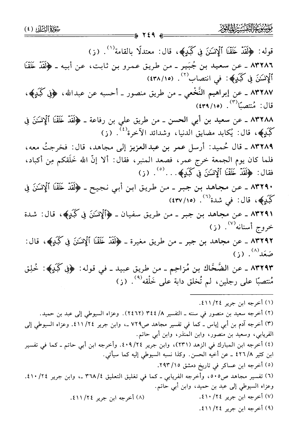 ٨٣٢٩٠ - عن مجاهد بن جبر -من طريق ابن أبي نجيح- {لَقَدْ خَلَقْنا الإنْسانَ فِي كَبَدٍ}، قال: في شدة (¬٦). (١٥/ ٤٣٧)