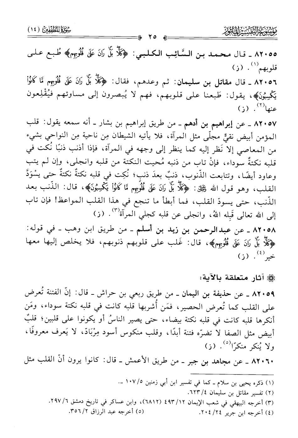 ٨٢٠٥٨ - عن عبد الرحمن بن زيد بن أسلم -من طريق ابن وهب- في قوله: {كَلّا بَلْ رانَ عَلى قُلُوبِهِمْ}، قال: غَلب على قلوبهم ذنوبهم، فلا يخلص إليها معها خير (¬٤). (ز)