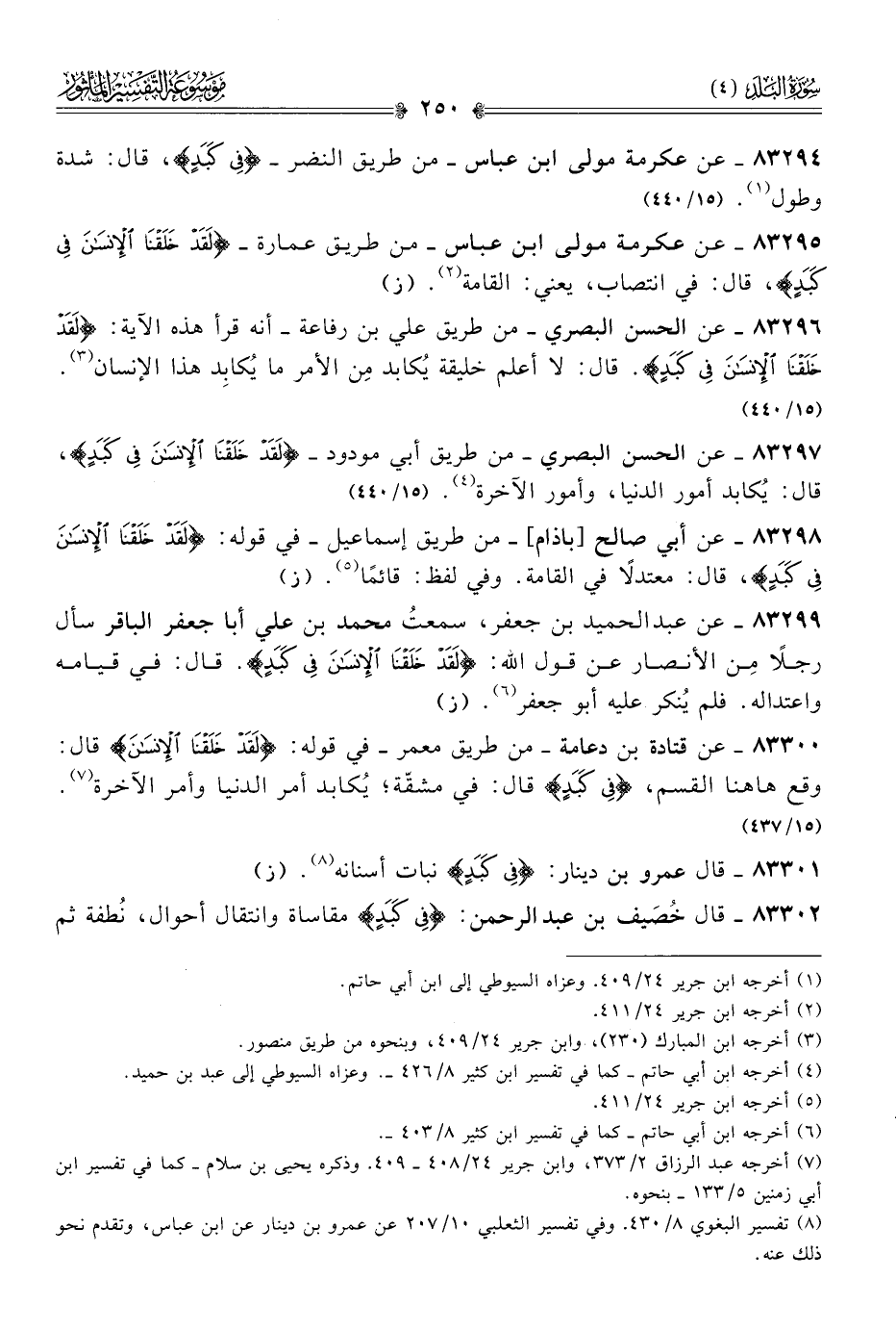 ٨٣٢٩٤ - عن عكرمة مولى ابن عباس -من طريق النضر- {فِي كَبَدٍ}، قال: شدة وطول (¬١). (١٥/ ٤٤٠)