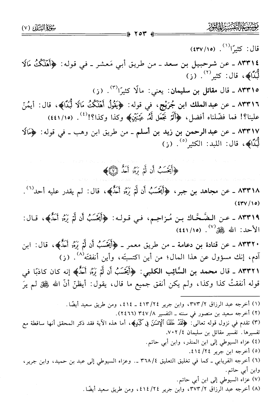 ٨٣٣١٨ - عن مجاهد بن جبر، {أيَحْسَبُ أنْ لَمْ يَرَهُ أحَدٌ}، قال: لم يقدر عليه أحد (¬٦). (١٥/ ٤٣٧)