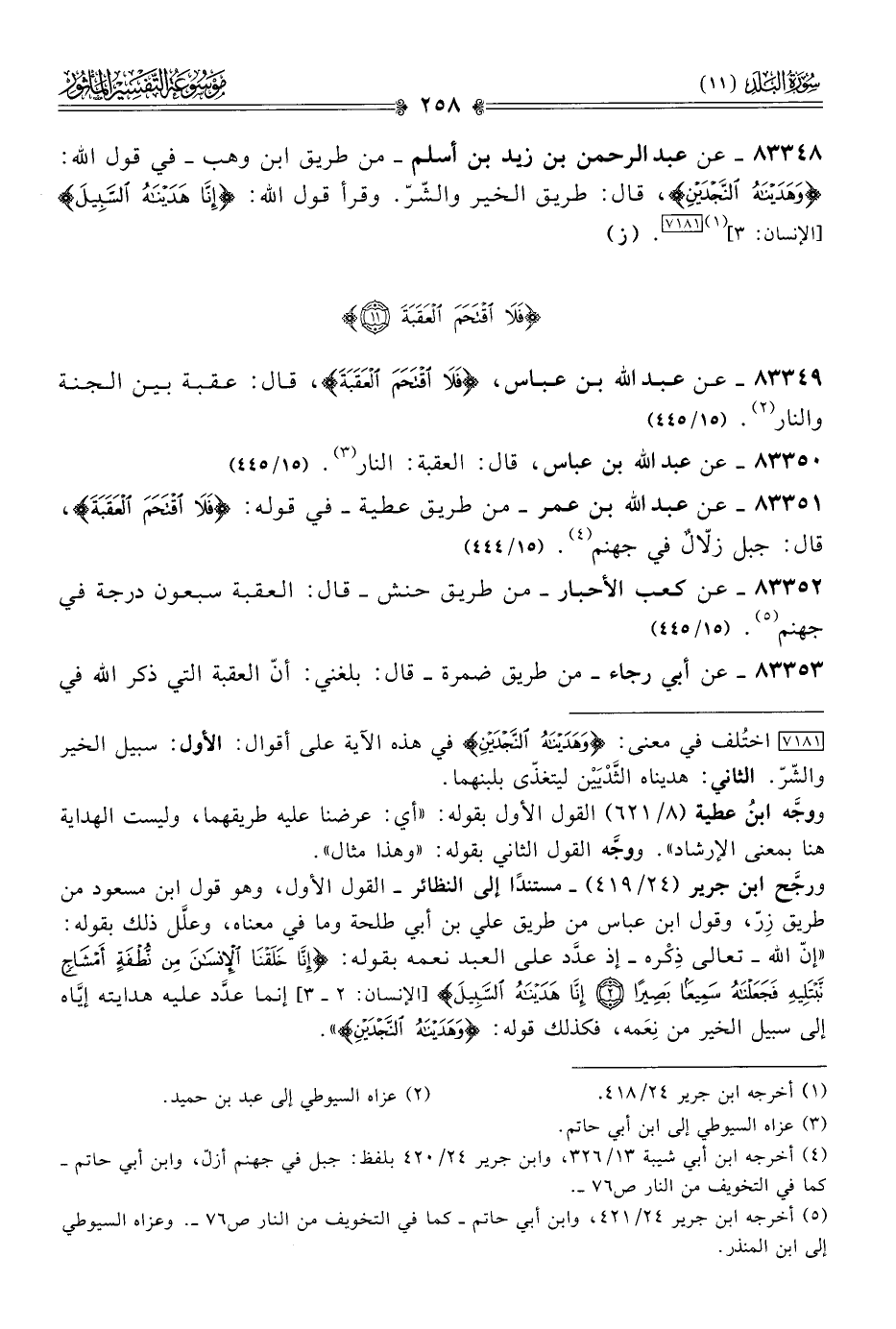 ٨٣٣٤٨ - عن عبد الرحمن بن زيد بن أسلم -من طريق ابن وهب- في قول الله: {وهَدَيْناهُ النَّجْدَيْنِ}، قال: طريق الخير والشّرّ. وقرأ قول الله: {إنّا هَدَيْناهُ السَّبِيلَ} [الإنسان: ٣] (¬١) [٧١٨١]. (ز)