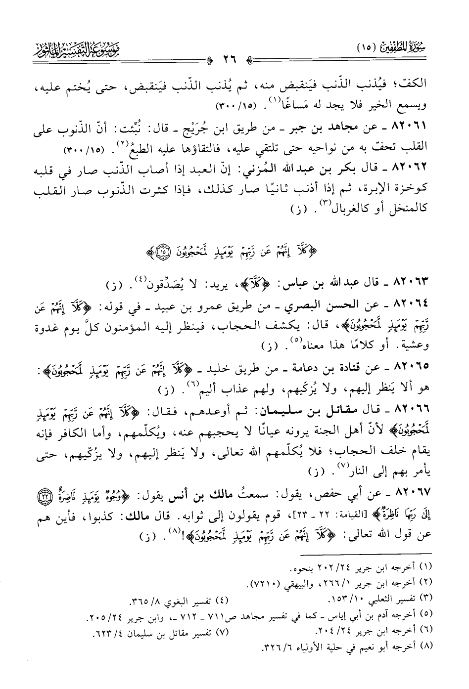 ٨٢٠٦٥ - عن قتادة بن دعامة -من طريق خليد- {كَلّا إنَّهُمْ عَنْ رَبِّهِمْ يَوْمَئِذٍ لَمَحْجُوبُونَ}: هو ألا يَنظر إليهم، ولا يُزكّيهم، ولهم عذاب أليم (¬٦). (ز)