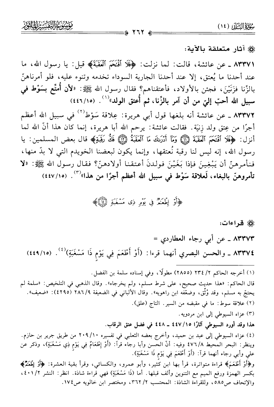 (¬٣) عزاه السيوطي إلى ابن مردويه. هذا وقد أورد السيوطي آثارًا ١٥/ ٤٤٧ - ٤٤٨ في فضل عتق الرقاب.
