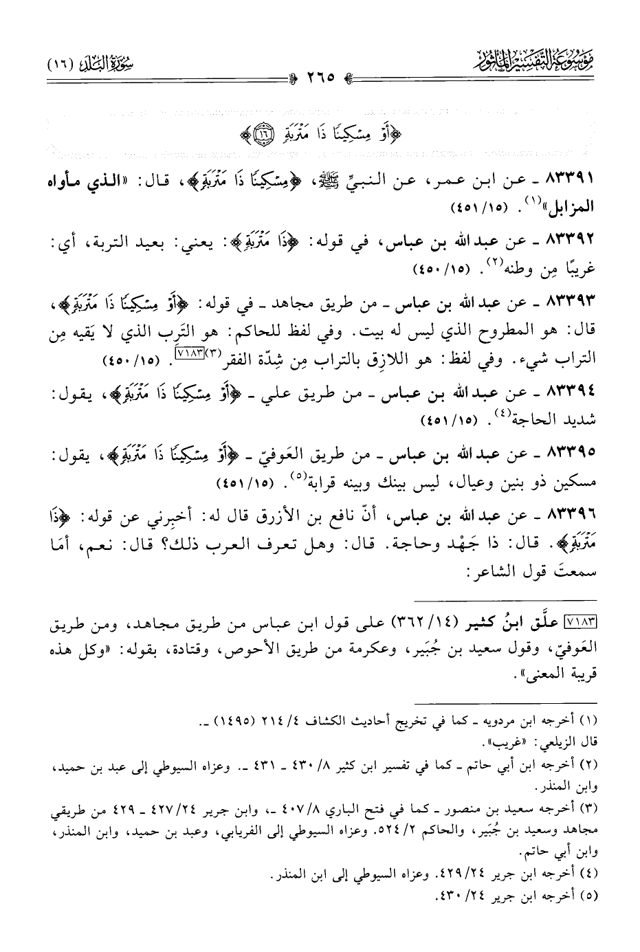 ٨٣٣٩١ - عن ابن عمر، عن النبيِّ - صلى الله عليه وسلم -، {مِسْكِينًا ذا مَتْرَبَةٍ}، قال: «الذي مأواه المزابل» (¬١). (١٥/ ٤٥١)
