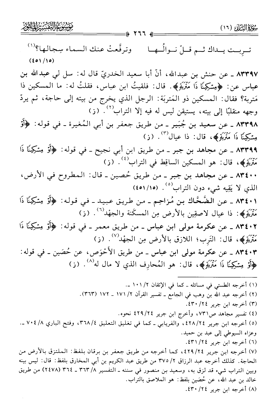 ٨٣٣٩٧ - عن حنش بن عبد الله، أنّ أبا سعيد الخدريّ قال له: سل لي عبد الله بن عباس عن: {مِسْكِينًا ذا مَتْرَبَةٍ}. قال: فلقيتُ ابن عباس، فقلتُ له: ما المسكين ذا مَتربة؟ فقال: المسكين ذو المَتربَة: الرجل الذي يخرج من بيته إلى حاجة، ثم يردّ وجهه منقلبًا إلى بيته، يستيقن ليس له فيه إلا التراب (¬٢). (ز)
