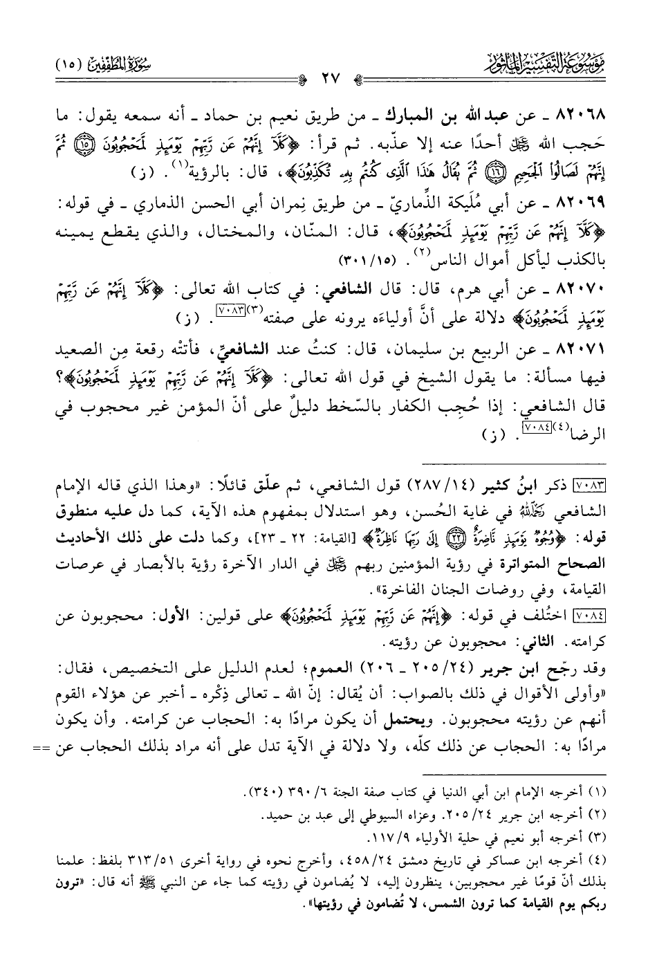 [٧٠٨٣] ذكر ابنُ كثير (١٤/ ٢٨٧) قول الشافعي، ثم علّق قائلًا: «وهذا الذي قاله الإمام الشافعي? في غاية الحُسن، وهو استدلال بمفهوم هذه الآية، كما دل عليه منطوق قوله: {وجوه يومئذ ناضرة إلى ربها ناظرة} [القيامة: ٢٢ - ٢٣]، وكما دلت على ذلك الأحاديث الصحاح المتواترة في رؤية المؤمنين ربهم - عز وجل - في الدار الآخرة رؤية بالأبصار في عرصات القيامة، وفي روضات الجنان الفاخرة».