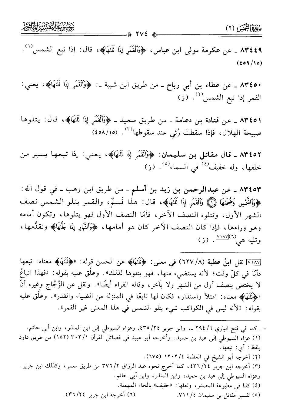 ٨٣٤٥٠ - عن عطاء بن أبي رباح -من طريق ابن شيبة-: {والقمر إذا تلاها}، يعني: القمر إذا تبع الشمس (¬٢). (ز)