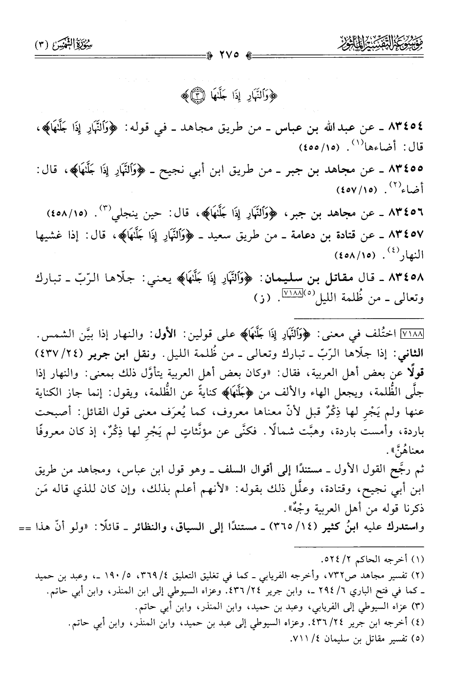 ٨٣٤٥٦ - عن مجاهد بن جبر، {والنَّهارِ إذا جَلّاها}، قال: حين ينجلي (¬٣). (١٥/ ٤٥٨)