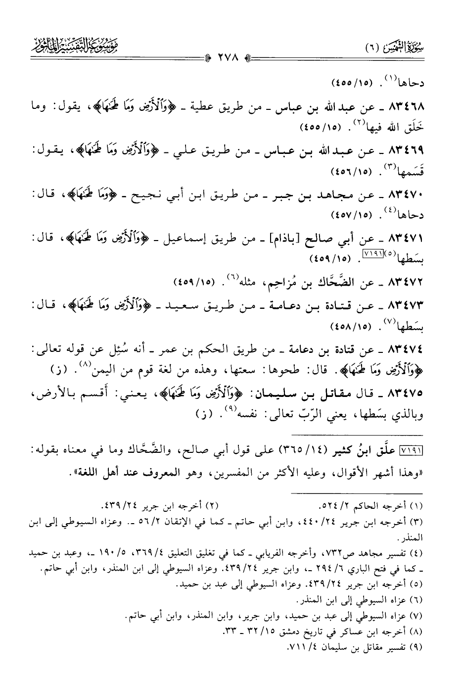 ٨٣٤٧١ - عن أبي صالح [باذام]-من طريق إسماعيل- {والأَرْضِ وما طَحاها}، قال: بسَطها (¬٥) [٧١٩١]. (١٥/ ٤٥٩)