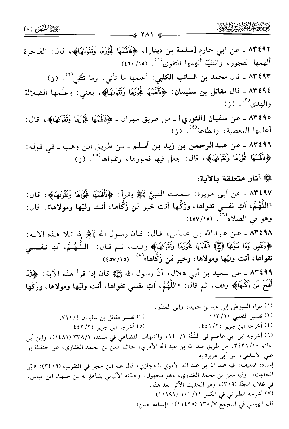٨٣٤٩٨ - عن عبد الله بن عباس، قال: كان رسول الله - صلى الله عليه وسلم - إذا تلا هذه الآية: {ونَفْسٍ وما سَوّاها * فَأَلْهَمَها فُجُورَها وتَقْواها} وقف، ثم قال: «اللهم، آتِ نفسي تقواها، أنت وليّها ومولاها، وخير مَن زَكّاها» (¬٧). (١٥/ ٤٥٧)