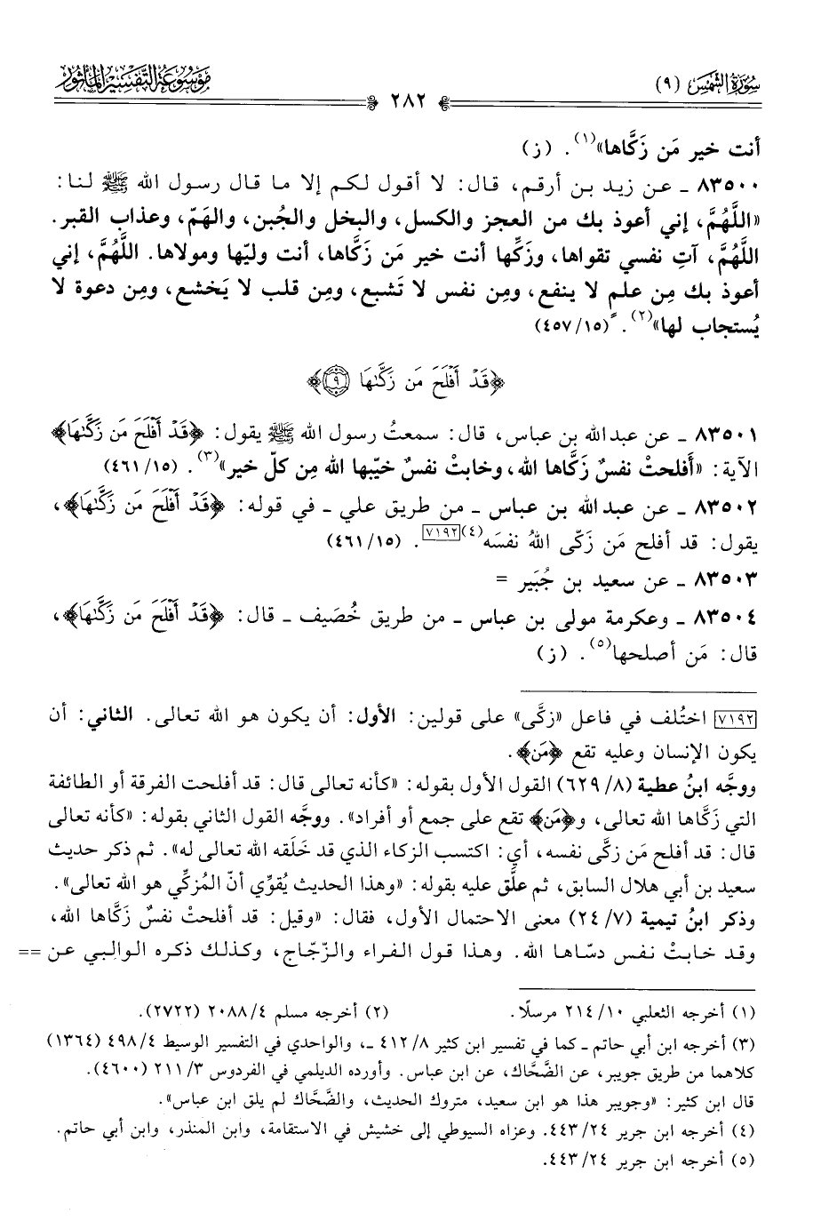 ٨٣٥٠١ - عن عبد الله بن عباس، قال: سمعتُ رسول الله - صلى الله عليه وسلم - يقول: {قَدْ أفْلَحَ مَن زَكّاها} الآية: «أفلحتْ نفسٌ زَكّاها الله، وخابتْ نفسٌ خيّبها الله مِن كلّ خير» (¬٣). (١٥/ ٤٦١)