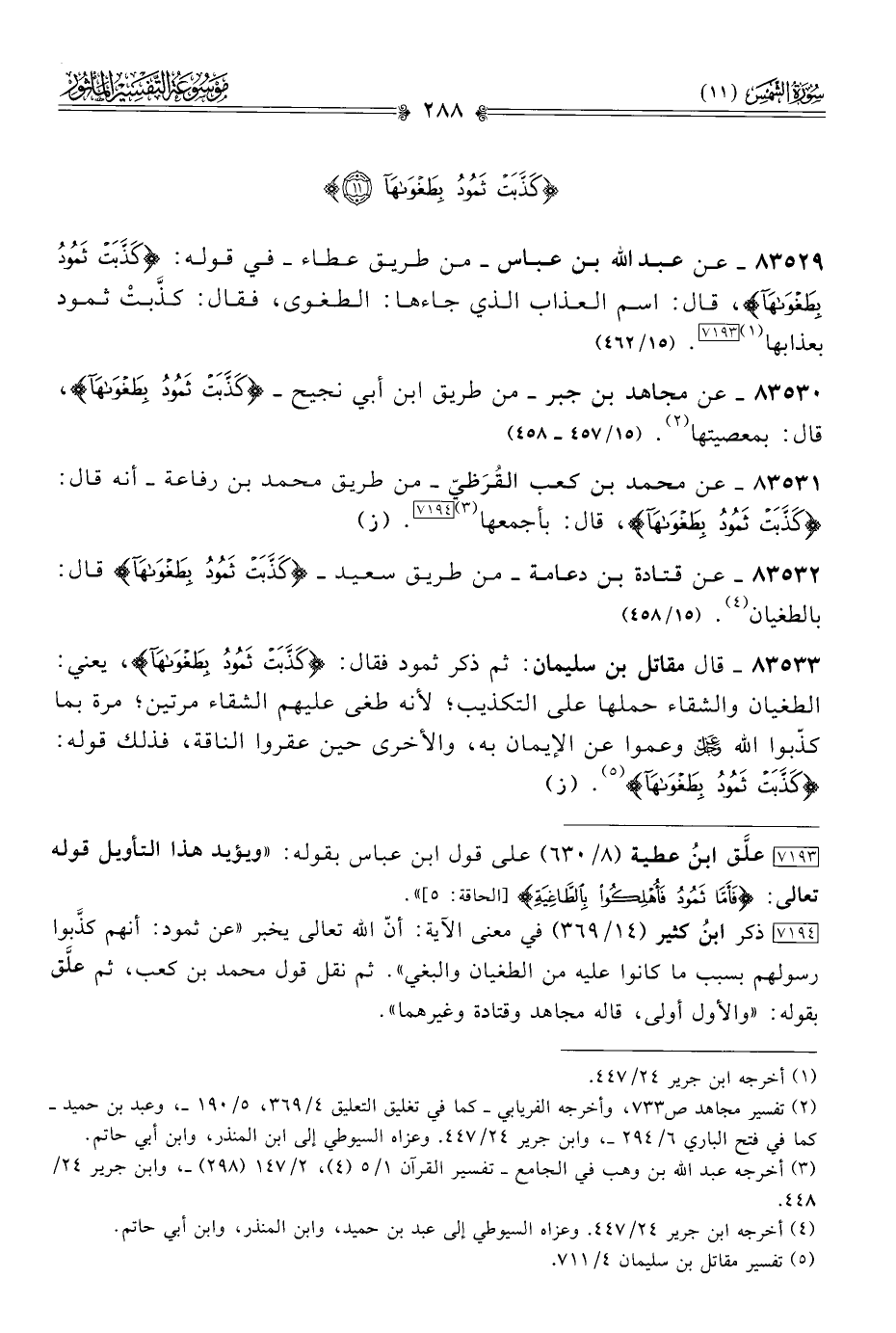 ٨٣٥٣٠ - عن مجاهد بن جبر -من طريق ابن أبي نجيح- {كَذَّبَتْ ثَمُودُ بِطَغْواها}، قال: بمعصيتها (¬٢). (١٥/ ٤٥٧ - ٤٥٨)