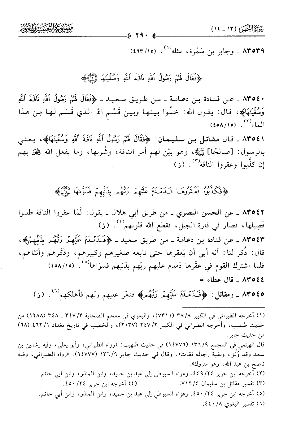 ٨٣٥٤٣ - عن قتادة بن دعامة -من طريق سعيد- {فَدَمْدَمَ عَلَيْهِمْ رَبُّهُمْ بِذَنْبِهِمْ}، قال: ذُكر لنا: أنه أبى أن يَعقرها حتى تابعه صغيرهم وكبيرهم، وذَكَرهم وأنثاهم، فلما اشترك القوم في عقْرها دَمدم عليهم ربّهم بذنبهم فسوّاها (¬٥). (١٥/ ٤٥٨)