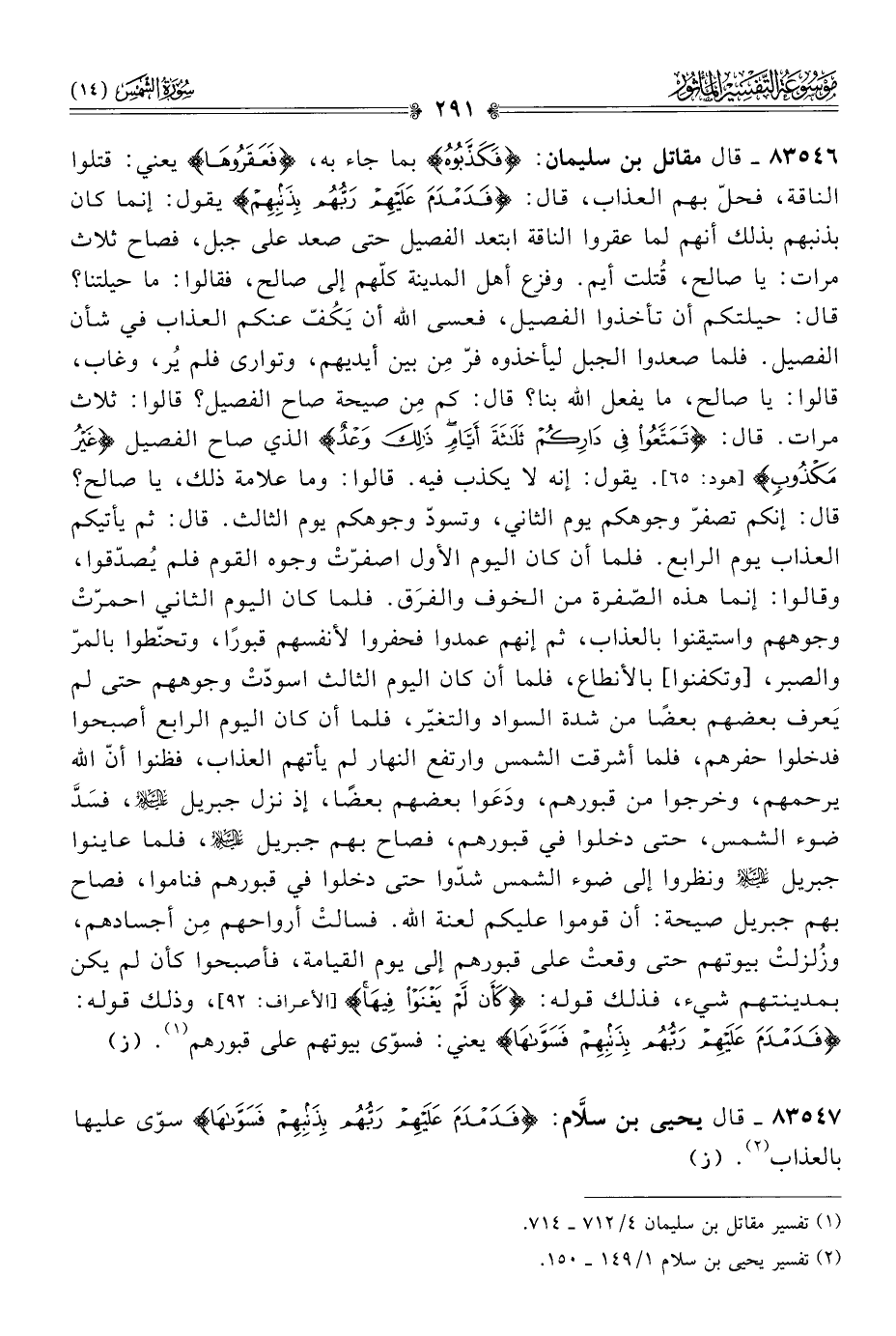 ٨٣٥٤٦ - قال مقاتل بن سليمان: {فَكَذَّبُوهُ} بما جاء به، {فَعَقَرُوها} يعني: قتلوا الناقة، فحلّ بهم العذاب، قال: {فَدَمْدَمَ عَلَيْهِمْ رَبُّهُمْ بِذَنْبِهِمْ} يقول: إنما كان بذنبهم بذلك أنهم لما عقروا الناقة ابتعد الفصيل حتى صعد على جبل، فصاح ثلاث مرات: يا صالح، قُتلت أيم. وفزع أهل المدينة كلّهم إلى صالح، فقالوا: ما حيلتنا؟ قال: حيلتكم أن تأخذوا الفصيل، فعسى الله أن يَكُفّ عنكم العذاب في شأن الفصيل. فلما صعدوا الجبل ليأخذوه فرّ مِن بين أيديهم، وتوارى فلم يُر، وغاب، قالوا: يا صالح، ما يفعل الله بنا؟ قال: كم مِن صيحة صاح الفصيل؟ قالوا: ثلاث مرات. قال: {تَمَتَّعُوا فِي دارِكُمْ ثَلاثَةَ أيّامٍ ذلك وعد} الذي صاح الفصيل {غَيْرُ مَكْذُوبٍ} [هود: ٦٥]. يقول: إنه لا يكذب فيه. قالوا: وما علامة ذلك، يا صالح؟ قال: إنكم تصفرّ وجوهكم يوم الثاني، وتسودّ وجوهكم يوم الثالث. قال: ثم يأتيكم العذاب يوم الرابع. فلما أن كان اليوم الأول اصفرّتْ وجوه القوم فلم يُصدّقوا، وقالوا: إنما هذه الصّفرة من الخوف والفرَق. فلما كان اليوم الثاني احمرّتْ وجوههم واستيقنوا بالعذاب، ثم إنهم عمدوا فحفروا لأنفسهم قبورًا، وتحنّطوا بالمرّ والصبر، [وتكفنوا] بالأنطاع، فلما أن كان اليوم الثالث اسودّتْ وجوههم حتى لم يَعرف بعضهم بعضًا من شدة السواد والتغيّر، فلما أن كان اليوم الرابع أصبحوا فدخلوا حفرهم، فلما أشرقت الشمس وارتفع النهار لم يأتهم العذاب، فظنوا أنّ الله يرحمهم، وخرجوا من قبورهم، ودَعَوا بعضهم بعضًا، إذ نزل جبريل - عليه السلام -، فسَدَّ ضوء الشمس، حتى دخلوا في قبورهم، فصاح بهم جبريل - عليه السلام -، فلما عاينوا جبريل - عليه السلام - ونظروا إلى ضوء الشمس شدّوا حتى دخلوا في قبورهم فناموا، فصاح بهم جبريل صيحة: أن قوموا عليكم لعنة الله. فسالتْ أرواحهم مِن أجسادهم، وزُلزلتْ بيوتهم حتى وقعتْ على قبورهم إلى يوم القيامة، فأصبحوا كأن لم يكن بمدينتهم شيء، فذلك قوله: {كَأَنْ لَمْ يَغْنَوْا فِيها} [الأعراف: ٩٢]، وذلك قوله: {فَدَمْدَمَ عَلَيْهِمْ رَبُّهُمْ بِذَنْبِهِمْ فَسَوّاها} يعني: فسوّى بيوتهم على قبورهم (¬١). (ز)