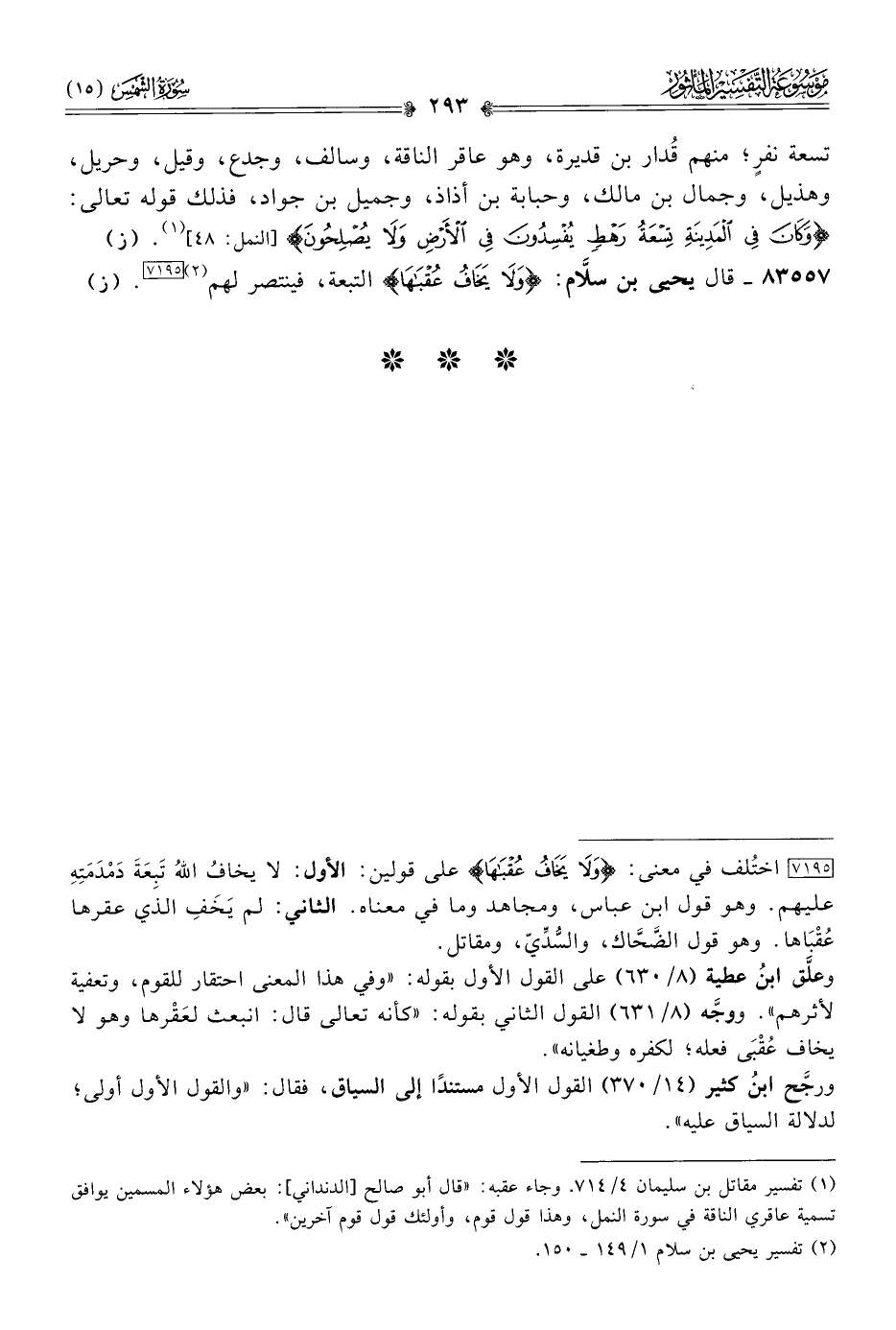 وعلَّق ابنُ عطية (٨/ ٦٣٠) على القول الأول بقوله: «وفي هذا المعنى احتقار للقوم، وتعفية لأثرهم». ووجَّه (٨/ ٦٣١) القول الثاني بقوله: «كأنه تعالى قال: انبعث لعَقْرها وهو لا يخاف عُقْبى فعله؛ لكفره وطغيانه».