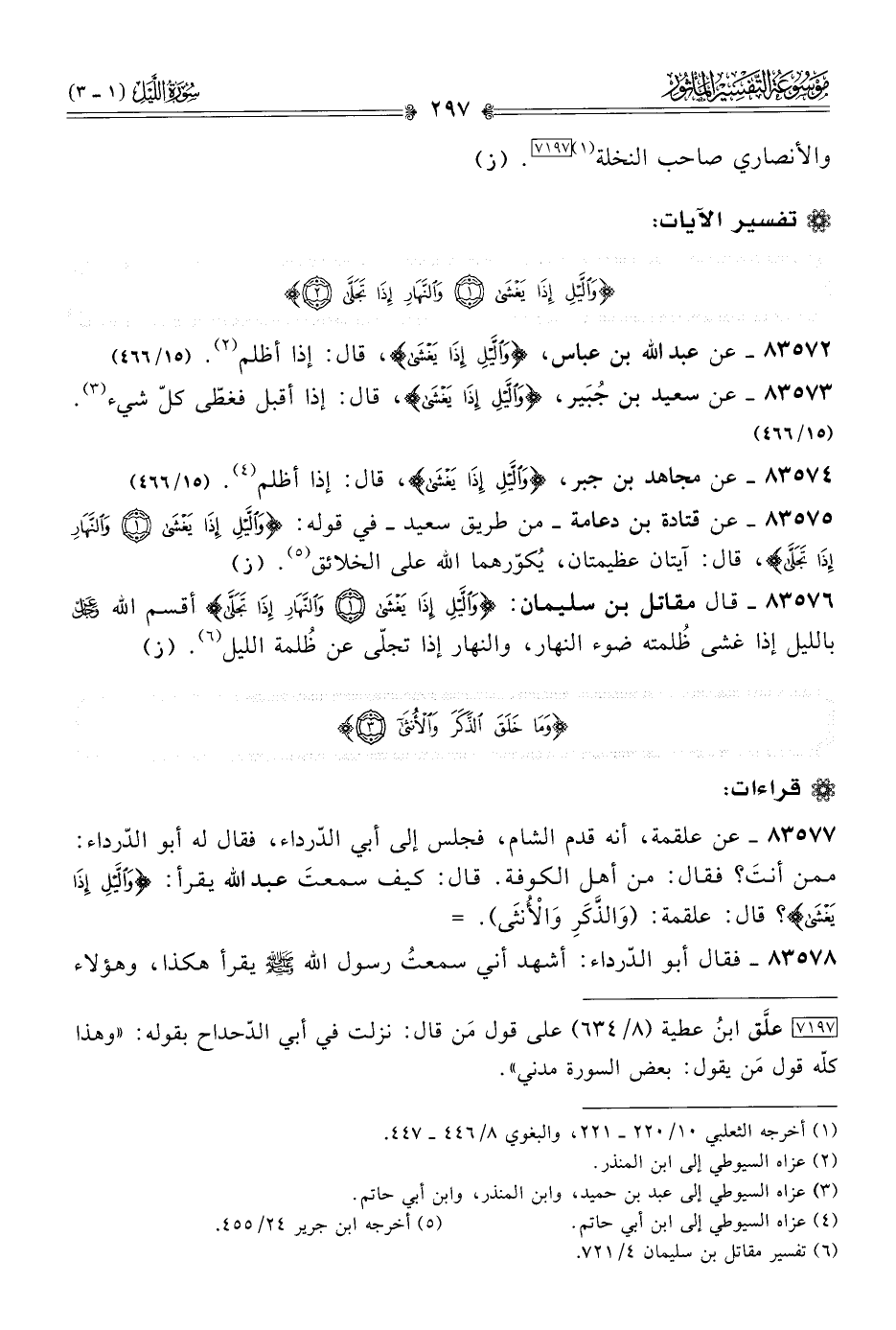 ٨٣٥٧٦ - قال مقاتل بن سليمان: {واللَّيْلِ إذا يَغْشى والنَّهارِ إذا تَجَلّى} أقسم الله - عز وجل - بالليل إذا غشى ظُلمته ضوء النهار، والنهار إذا تجلّى عن ظُلمة الليل (¬٦). (ز)