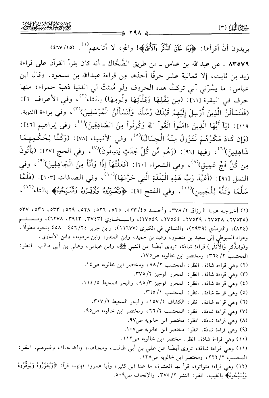 ٨٣٥٧٩ - عن عبد الله بن عباس -من طريق الضَّحّاك- أنه كان يقرأ القرآن على قراءة زيد بن ثابت، إلا ثمانية عشر حرفًا أخذها مِن قراءة عبد الله بن مسعود. وقال ابن عباس: ما يسُرّني أني تركتُ هذه الحروف ولو مُلئتْ لي الدنيا ذهبة حمراء؛ منها حرف في البقرة [٦١]: (مِن بَقْلِها وقِثَّآئِها وثُومِها) بالثاء (¬٢)، وفي الأعراف [٦]: (فَلَنَسْأَلَنَّ الَّذِينَ أُرْسِلَ إلَيْهِمْ قَبْلَكَ رُسُلُنا ولَنَسْأَلَنَّ المُرْسَلِينَ) (¬٣)، وفي براءة [التوبة: ١١٩]: (يَآ أيُّها الَّذِينَ ءامَنُواْ اتَّقُواْ اللهَ وكُونُواْ مِنَ الصّادِقِينَ) (¬٤)، وفي إبراهيم [٤٦]: (وإن كادَ مَكْرُهُمْ لَتَزُولُ مِنهُ الجِبالُ) (¬٥)، وفي الأنبياء [٧٨]: (وكُنّا لِحُكْمِهِما شاهِدِينَ) (¬٦)، وفيها [٩٦]: (وهُم مِّن كُلِّ جَدَثٍ يَنسِلُونَ) (¬٧)، وفي الحج [٢٧]: (يَأْتُونَ مِن كُلِّ فَجٍّ عَمِيقٍ) (¬٨)، وفي الشعراء [٢٠]: (فَعَلْتُهَآ إذًا وأَناْ مِنَ الجاهِلِينَ) (¬٩)، وفي النمل [٩١]: (أعْبُدَ رَبَّ هَذِهِ البَلْدَةِ الَّتِي حَرَّمَها) (¬١٠)، وفي الصافات [١٠٣]: (فَلَمّا سَلَّما وتَلَّهُ لِلْجَبِينِ) (¬١١)، وفي الفتح [٩]: {وتُعَزِّرُوهُ وتُوَقِّرُوهُ وتُسَبِّحُوهُ} بالتاء (¬١٢)،