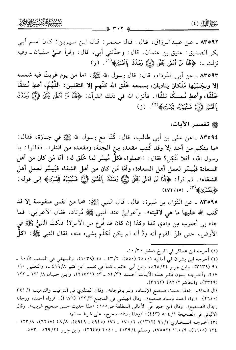 ٨٣٥٩٣ - عن أبي الدّرداء، قال: قال رسول الله - صلى الله عليه وسلم -: «ما من يوم غربتْ فيه شمسه إلا وبجَنبَيْها مَلَكان يناديان، يسمعه خَلْق الله كلّهم إلا الثقلين: اللهم، أعطِ مُنفقًا خَلَفًا، وأعطِ مُمسكًا تلفًا». فأنزل الله في ذلك القرآن: {فَأَمّا مَن أعْطى واتَّقى وصَدَّقَ بِالحُسْنى فَسَنُيَسِّرُهُ لِلْيُسْرى} (¬٢). (ز)
