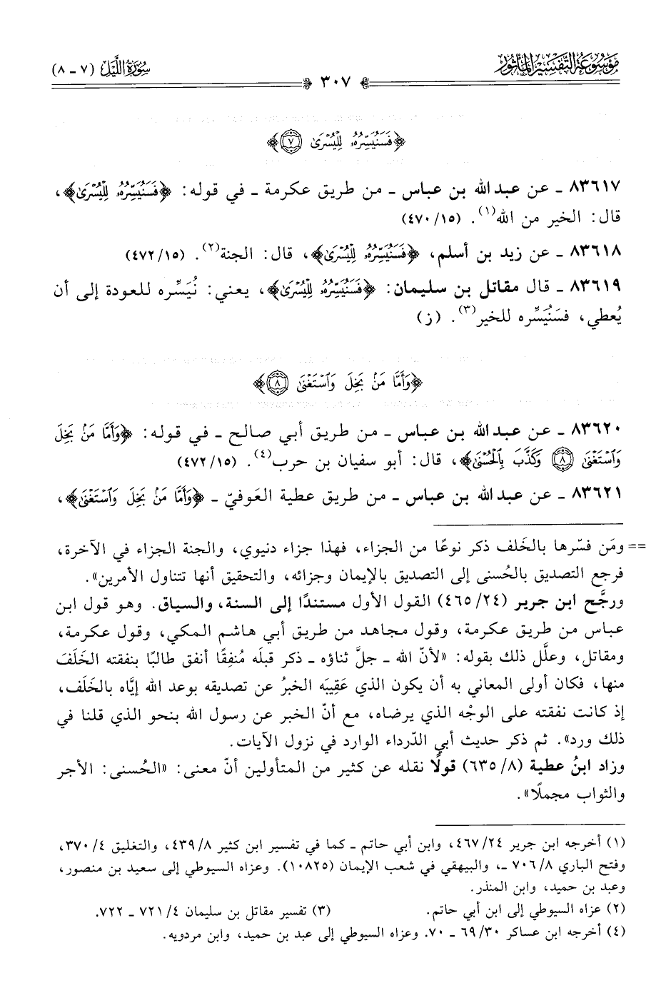 ٨٣٦١٩ - قال مقاتل بن سليمان: {فَسَنُيَسِّرُهُ لِلْيُسْرى}، يعني: نُيَسِّره للعودة إلى أن يُعطي، فسَنُيَسِّره للخير (¬٣). (ز)