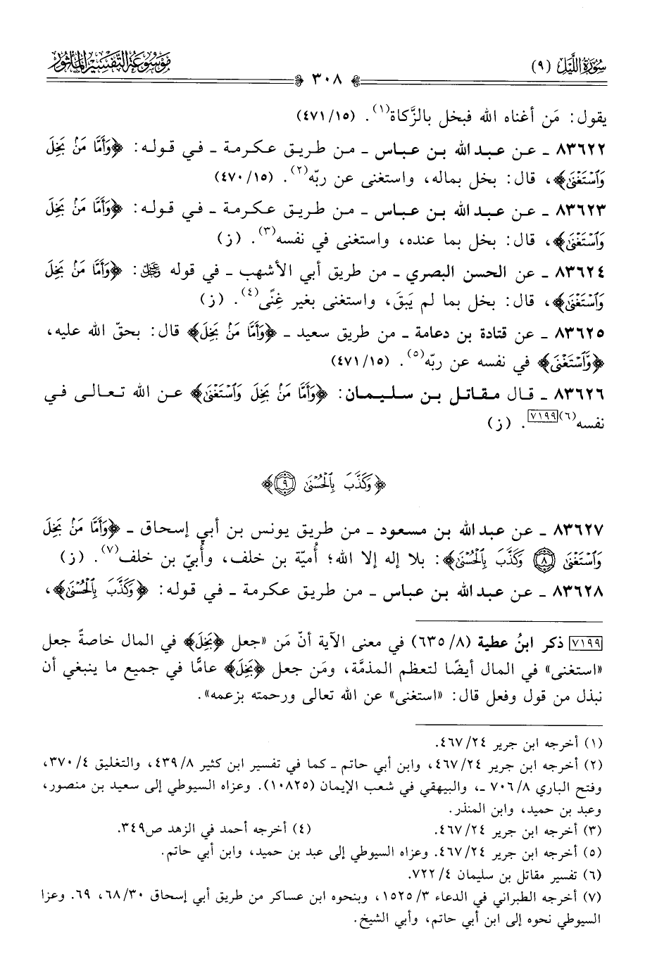 ٨٣٦٢٧ - عن عبد الله بن مسعود -من طريق يونس بن أبي إسحاق- {وأما من بخل واستغنى وكذب بالحسنى}: بلا إله إلا الله؛ أُميّة بن خلف، وأُبيّ بن خلف (¬٧). (ز)