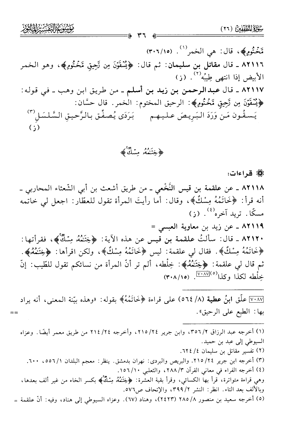 (¬٥) أخرجه سعيد بن منصور ٨/ ٢٨٥ (٢٤٢٣)، وهناد (٦٧). وعزاه السيوطي إلى هناد، وفيه: أنّ علقمة هو الذي قرأها: «خاتَمُهُ مِسْكٌ».