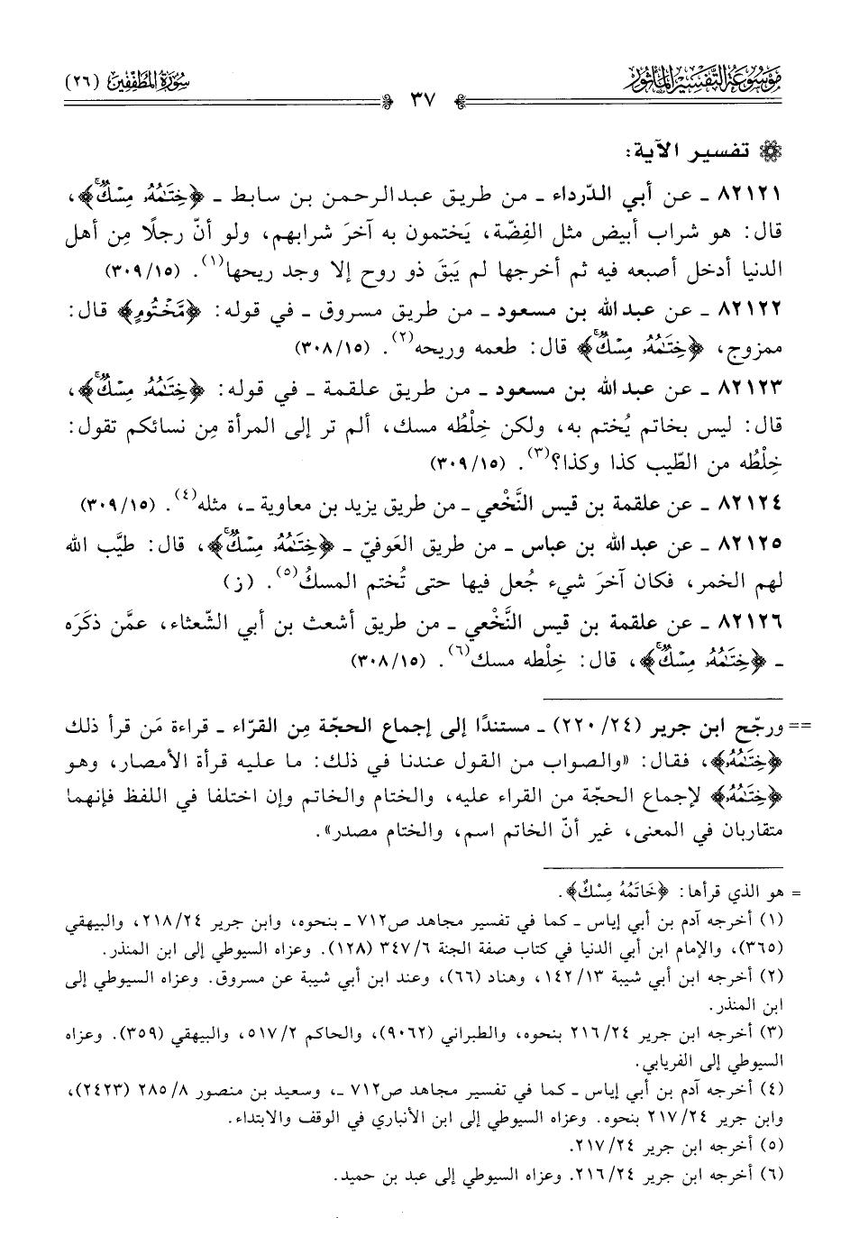٨٢١٢٢ - عن عبد الله بن مسعود -من طريق مسروق- في قوله: {مَخْتُومٍ} قال: ممزوج، {خِتامُهُ مِسْكٌ} قال: طعمه وريحه (¬٢). (١٥/ ٣٠٨)