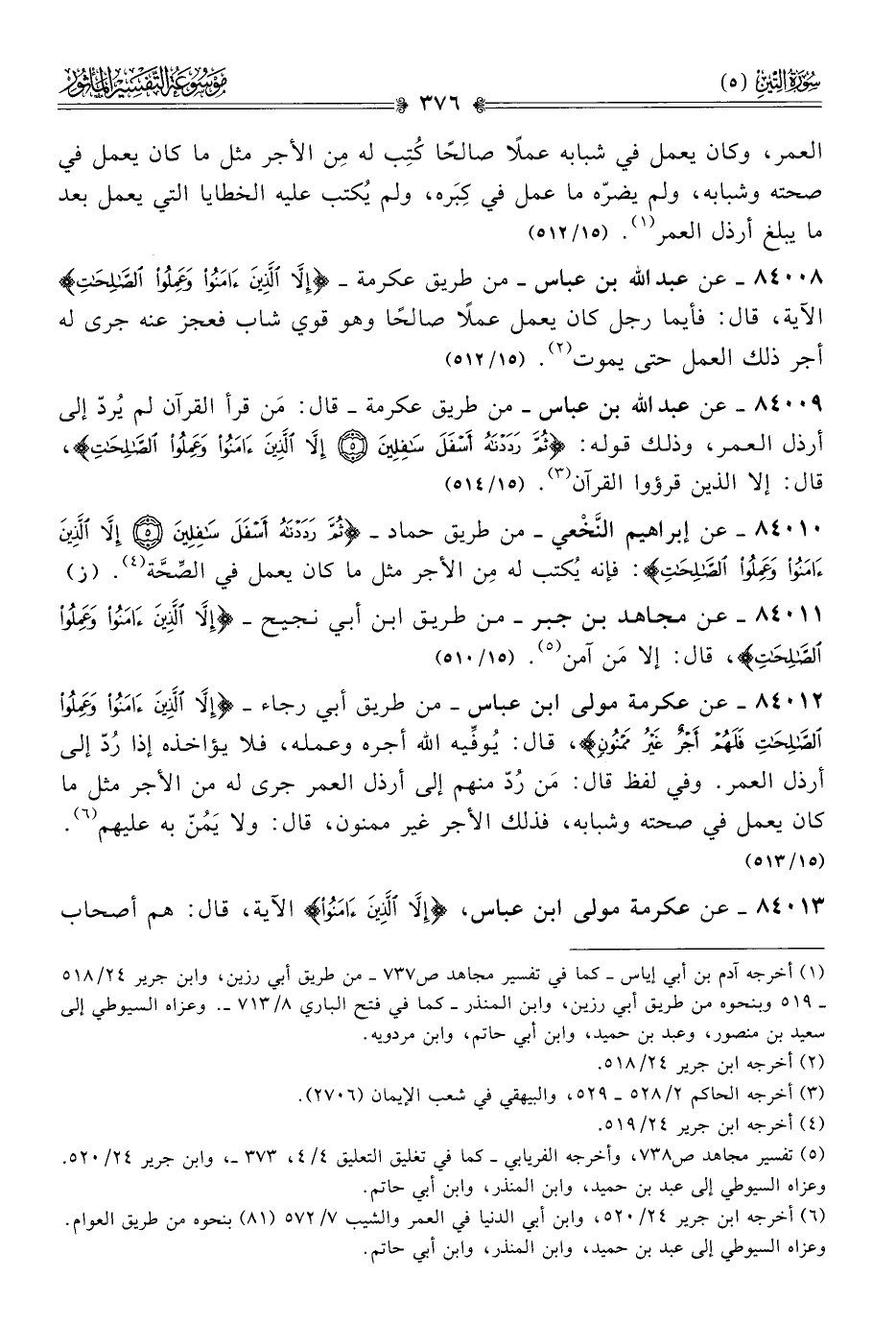 ٨٤٠١٢ - عن عكرمة مولى ابن عباس -من طريق أبي رجاء- {إلّا الَّذِينَ آمَنُوا وعَمِلُوا الصّالِحاتِ فَلَهُمْ أجْرٌ غَيْرُ مَمْنُونٍ}، قال: يُوفِّيه الله أجره وعمله، فلا يؤاخذه إذا رُدّ إلى أرذل العمر. وفي لفظ قال: مَن رُدّ منهم إلى أرذل العمر جرى له من الأجر مثل ما كان يعمل في صحته وشبابه، فذلك الأجر غير ممنون، قال: ولا يَمُنّ به عليهم (¬٦). (١٥/ ٥١٣)