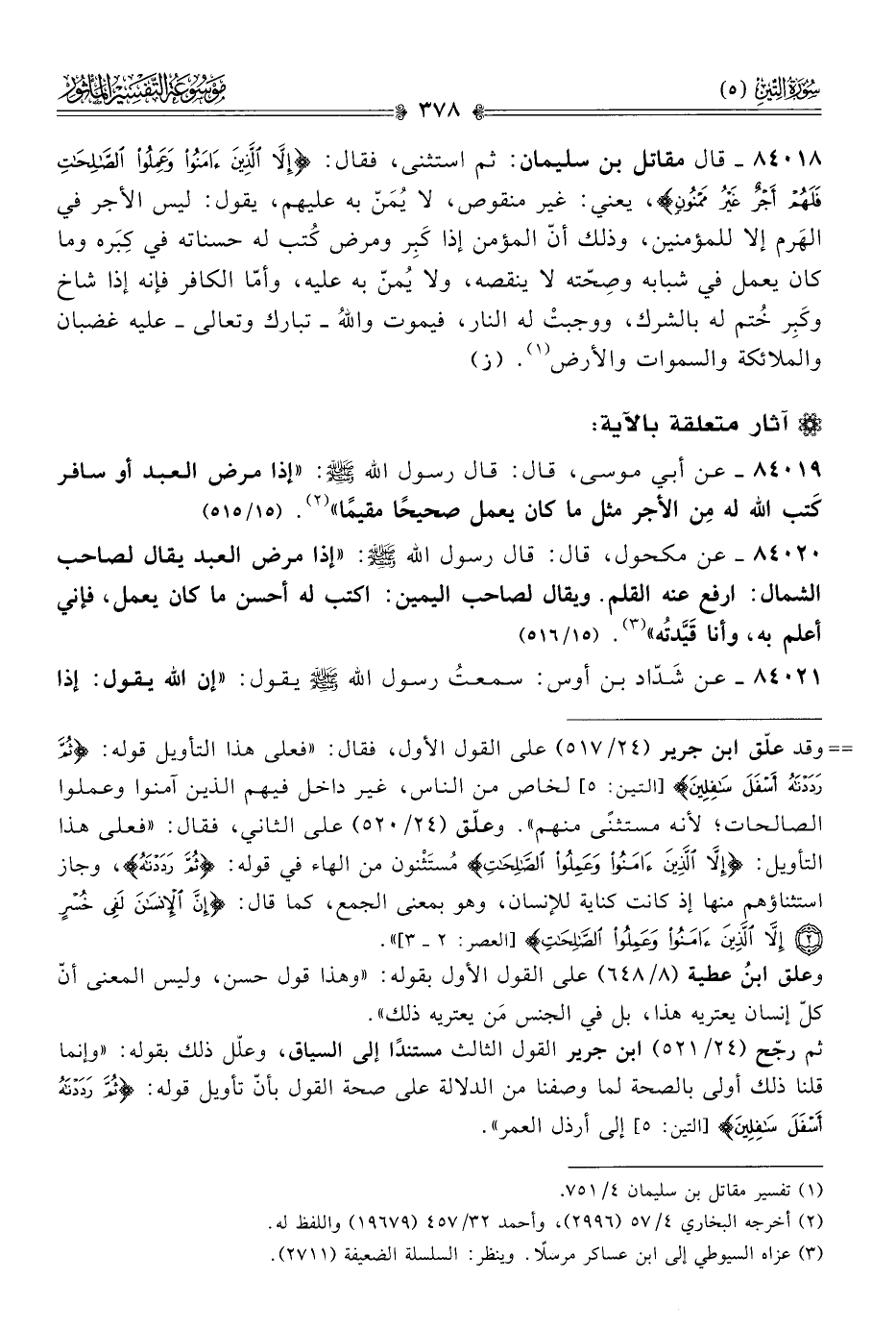 ٨٤٠١٨ - قال مقاتل بن سليمان: ثم استثنى، فقال: {إلّا الَّذِينَ آمَنُوا وعَمِلُوا الصّالِحاتِ فَلَهُمْ أجْرٌ غَيْرُ مَمْنُونٍ}، يعني: غير منقوص، لا يُمَنّ به عليهم، يقول: ليس الأجر في الهَرم إلا للمؤمنين، وذلك أنّ المؤمن إذا كَبِر ومرض كُتب له حسناته في كِبَره وما كان يعمل في شبابه وصِحّته لا ينقصه، ولا يُمنّ به عليه، وأمّا الكافر فإنه إذا شاخ وكَبِر خُتم له بالشرك، ووجبتْ له النار، فيموت واللهُ -تبارك وتعالى- عليه غضبان والملائكة والسموات والأرض (¬١). (ز)