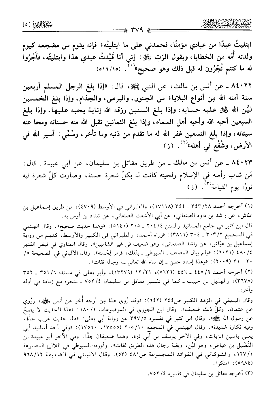 ٨٤٠٢٢ - عن أنس بن مالك، عن النبي - صلى الله عليه وسلم -، قال: «إذا بلغ الرجل المسلم أربعين سنة آمنه الله مِن أنواع البلايا؛ من الجنون، والبرص، والجذام، وإذا بلغ الخمسين ليَّن الله - عز وجل - عليه حسابه، وإذا بلغ الستين رزقه الله إنابة يحبه عليها، وإذا بلغ السبعين أحبه الله وأحبه أهل السماء، وإذا بلغ الثمانين تقبل الله منه حسناته ومحا عنه سيئاته، وإذا بلغ التسعين غفر الله له ما تقدم من ذنبه وما تأخر، وسُمِّي: أسير الله في الأرض، وشُفِّع في أهله» (¬٢). (ز)