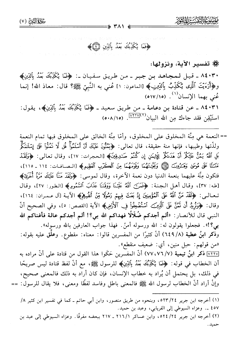 ٨٤٠٣٠ - قيل لمجاهد بن جبر -من طريق سفيان-: {فَما يُكَذِّبُكَ بَعْدُ بِالدِّينِ} و {أرَأَيْتَ الَّذِي يُكَذِّبُ بِالدِّينِ} [الماعون: ١] عُني به النَّبِيّ - صلى الله عليه وسلم -؟ قال: معاذ الله! إنما عُني بهما الإنسان (¬١). (١٥/ ٥١٧)
