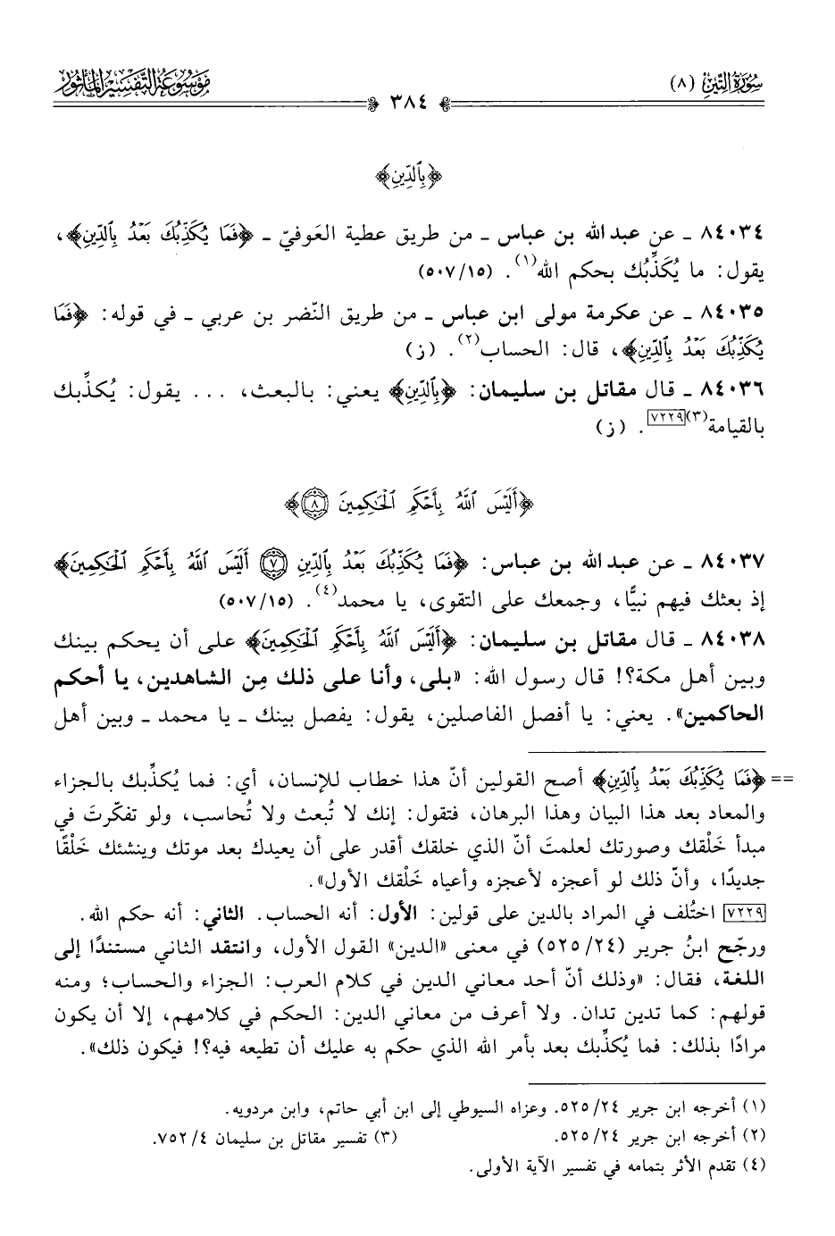 ٨٤٠٣٧ - عن عبد الله بن عباس: {فَما يُكَذِّبُكَ بَعْدُ بِالدِّينِ ألَيْسَ اللَّهُ بِأَحْكَمِ الحاكِمِينَ} إذ بعثك فيهم نبيًّا، وجمعك على التقوى، يا محمد (¬٤). (١٥/ ٥٠٧)