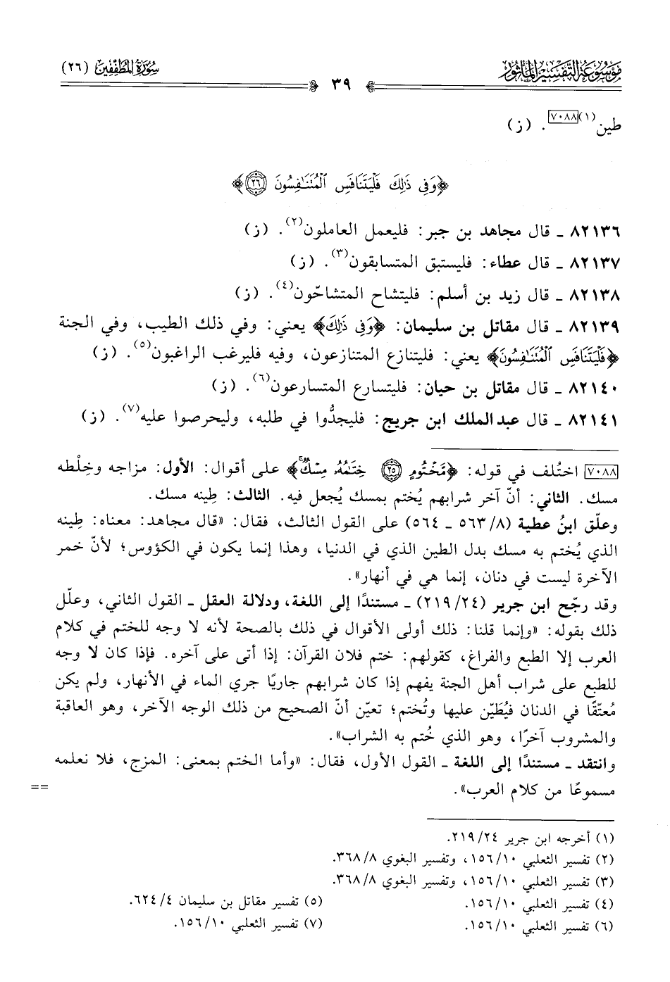 ٨٢١٣٩ - قال مقاتل بن سليمان: {وفِي ذَلِكَ} يعني: وفي ذلك الطيب، وفي الجنة {فَلْيَتَنافَسِ المُتَنافِسُونَ} يعني: فليتنازع المتنازعون، وفيه فليرغب الراغبون (¬٥). (ز)